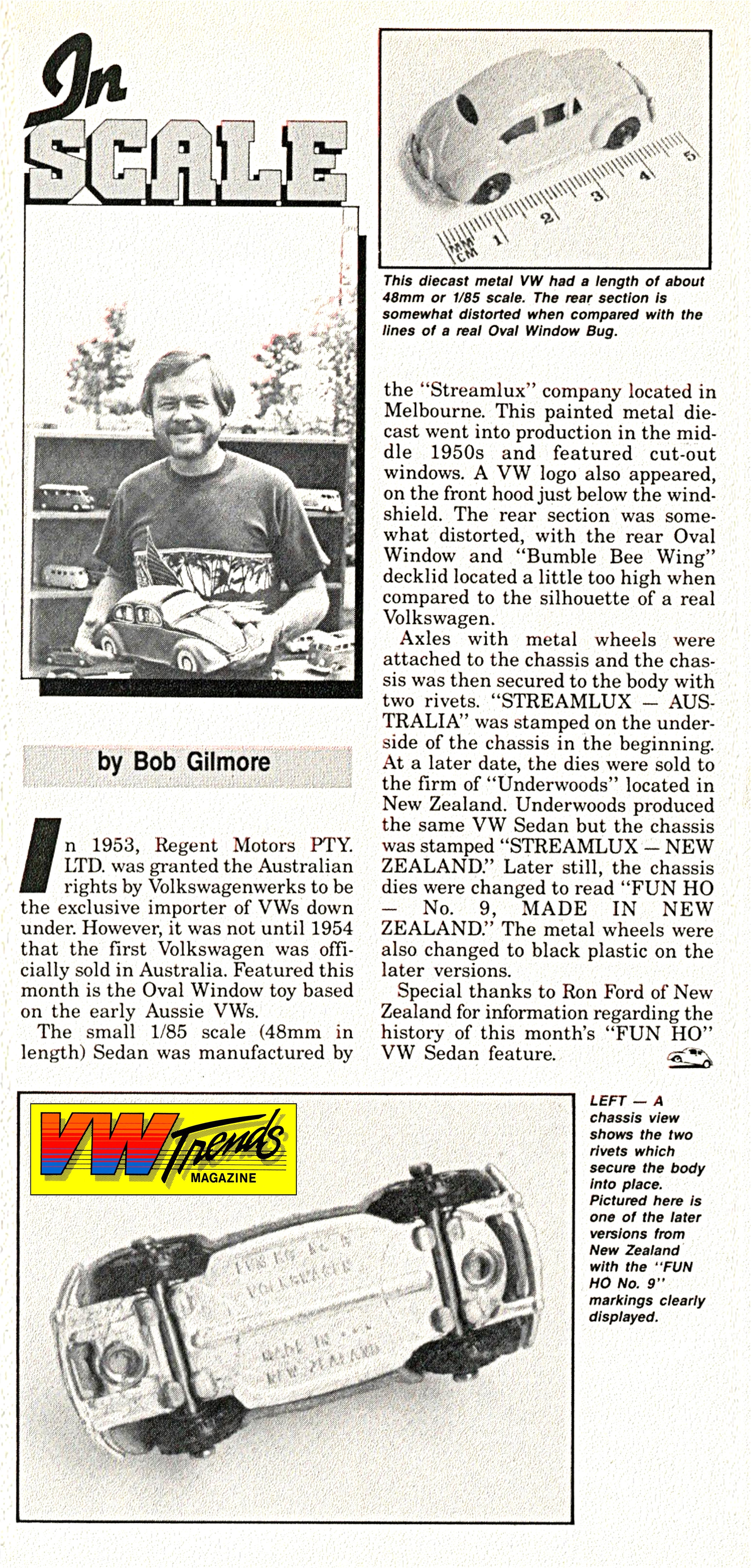 The first nine models, including this Oval VW, were produced using tooling purchased from the Australian STREAMLUX company. Early examples of the FUN HO! Oval VW still had STREAMLUX-AUST. cast into the baseplate