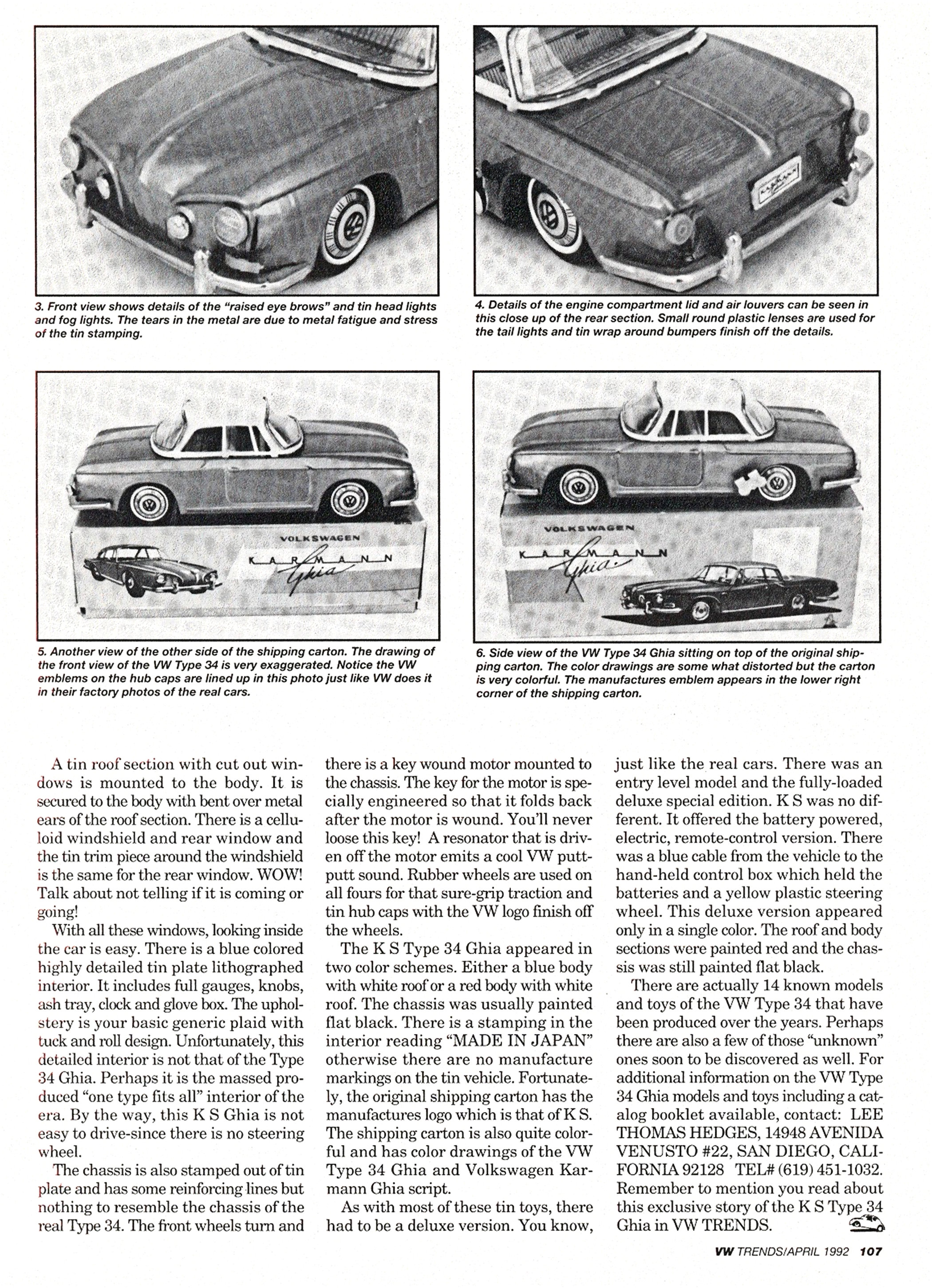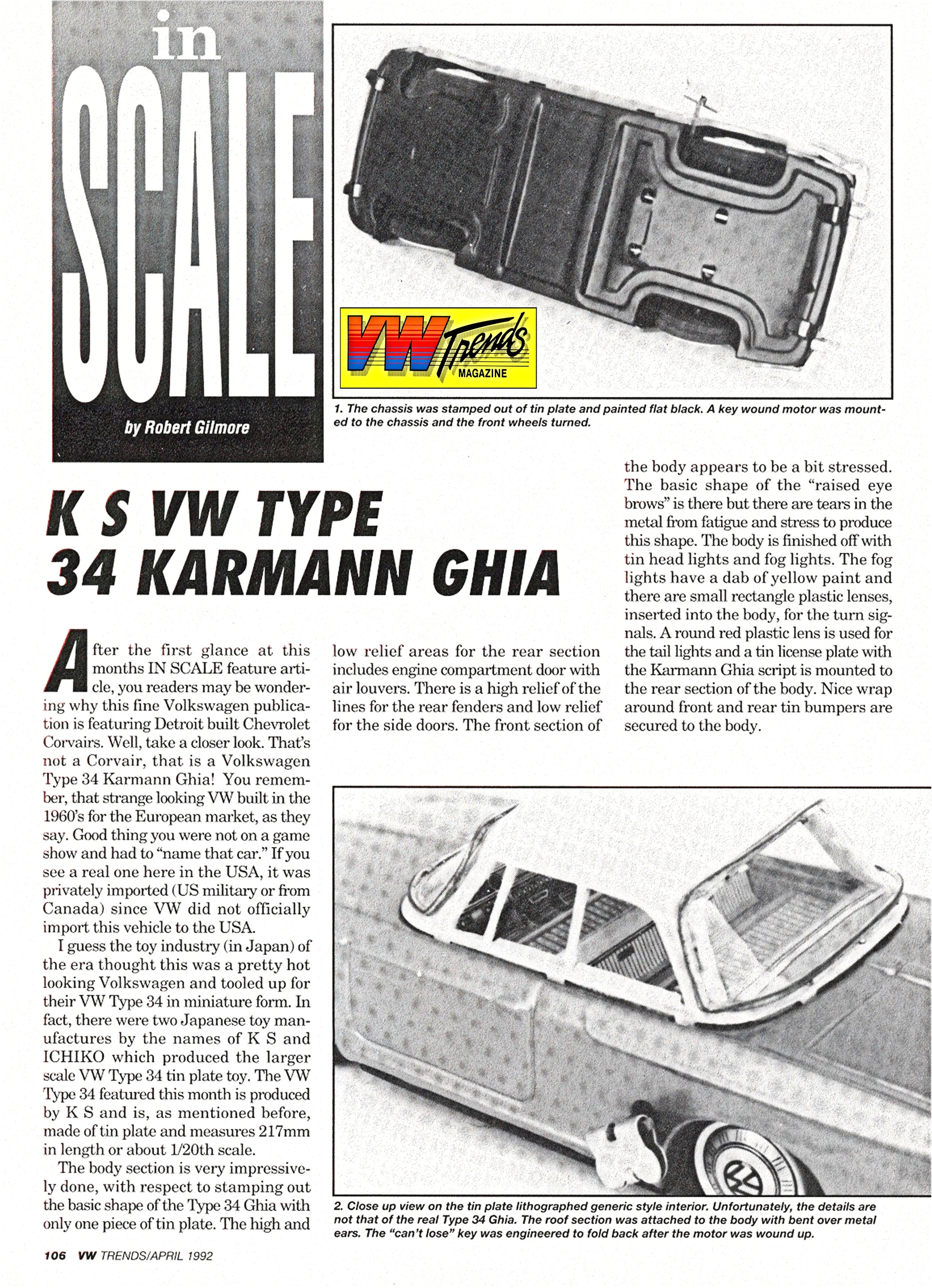 The VW Type 34 featured this article was produced by K S and is 1/20 scale, 8.5 inches or about 217 mm in length. The body section is amazing as far as stamping out the basic shape of the Type 34 Ghia with only one piece of tin plate.