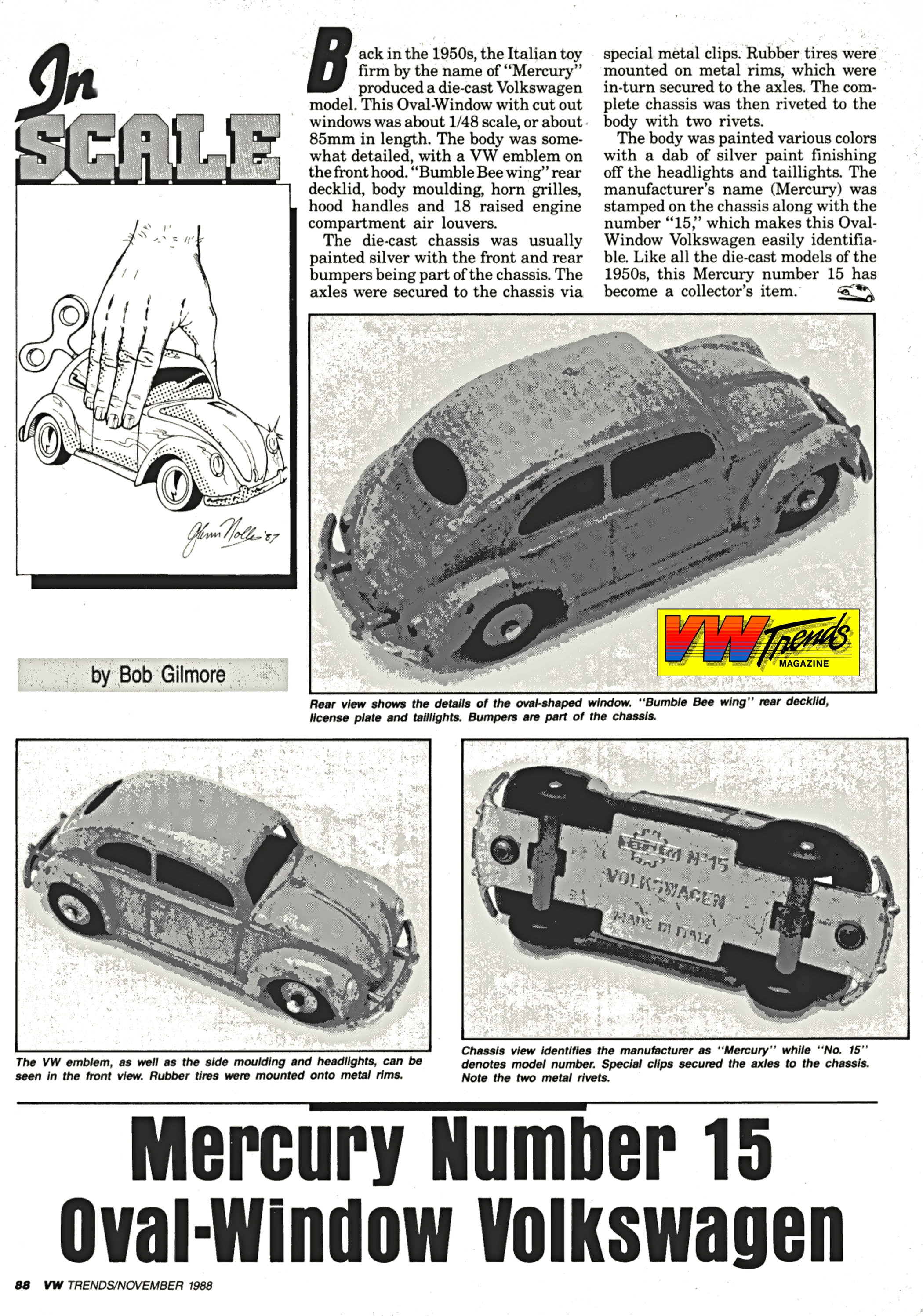 Diecast metal body with cut out windows and good details of front and rear hood, door seams and rear oval window with air louvers. Metal chassis with axles and metal rims with grey or black rubber tires. No motor and chassis stamped MERCURY NO 15 VOLKSWAGEN MADE IN ITALY.
