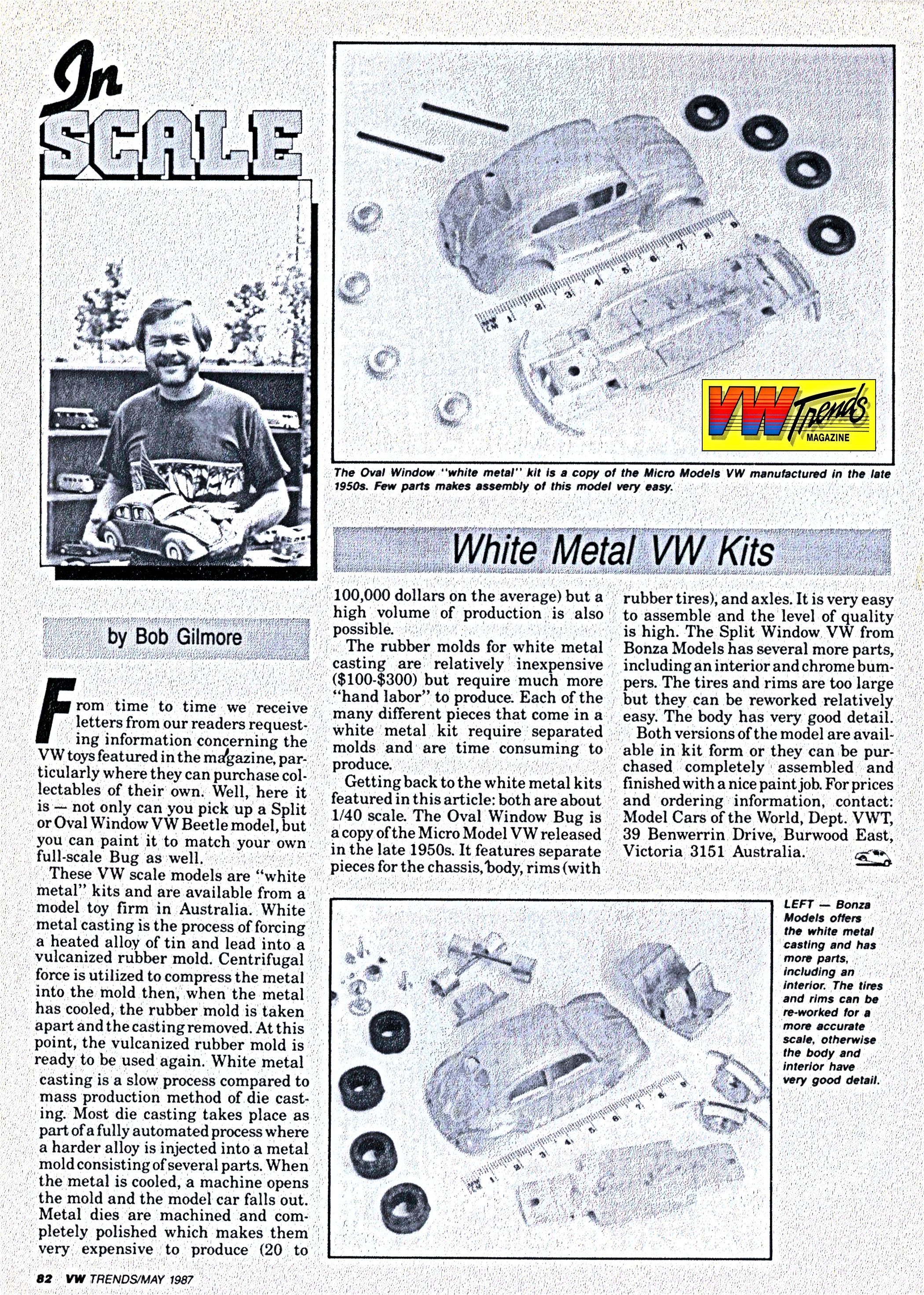 Well, here it is – not only can you pick up a Split or Oval VW Beetle model, but you can paint it to match your own full size Bug as well. These VW scale models are “white metal” kits and are available from a toy firm in Australia.