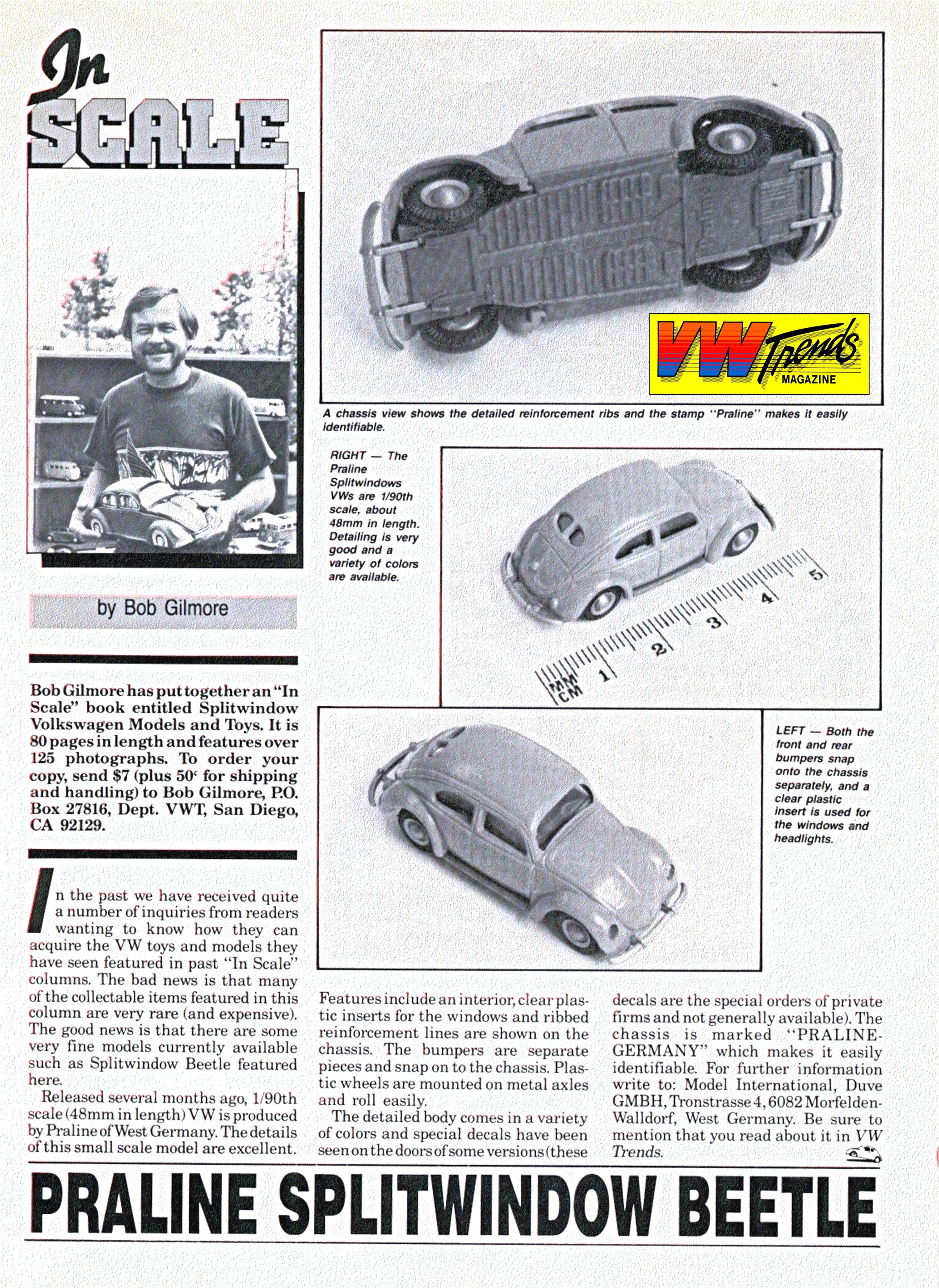 Released several months ago, a 1/90 scale (48mm in length) VW is released by Praline of West Germany. Details of this small scale model are excellent. Features include an interior, clear plastic insert for the windows and ribbed reinforcement lines are shown on the chassis.