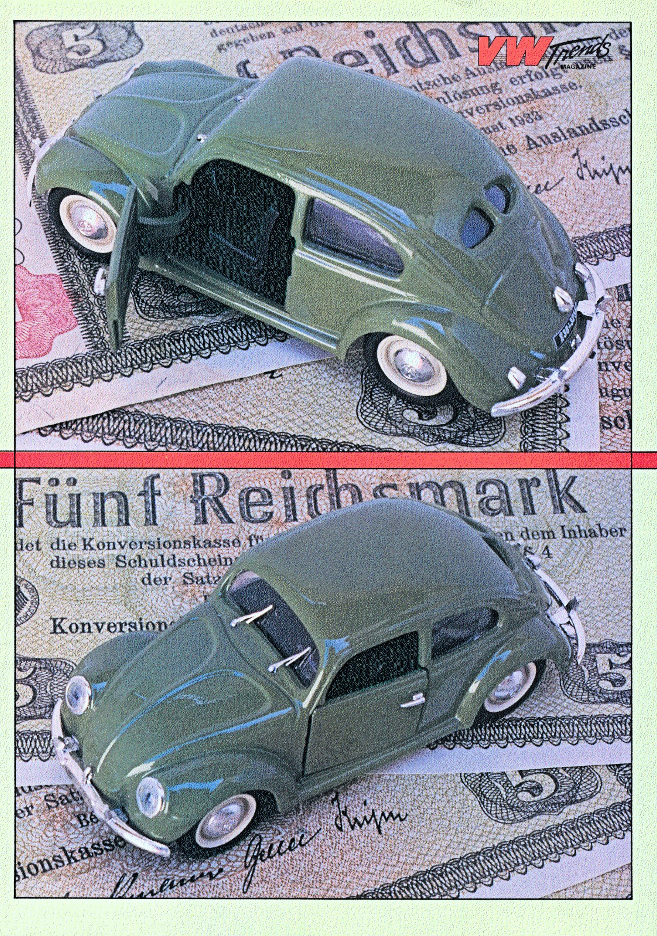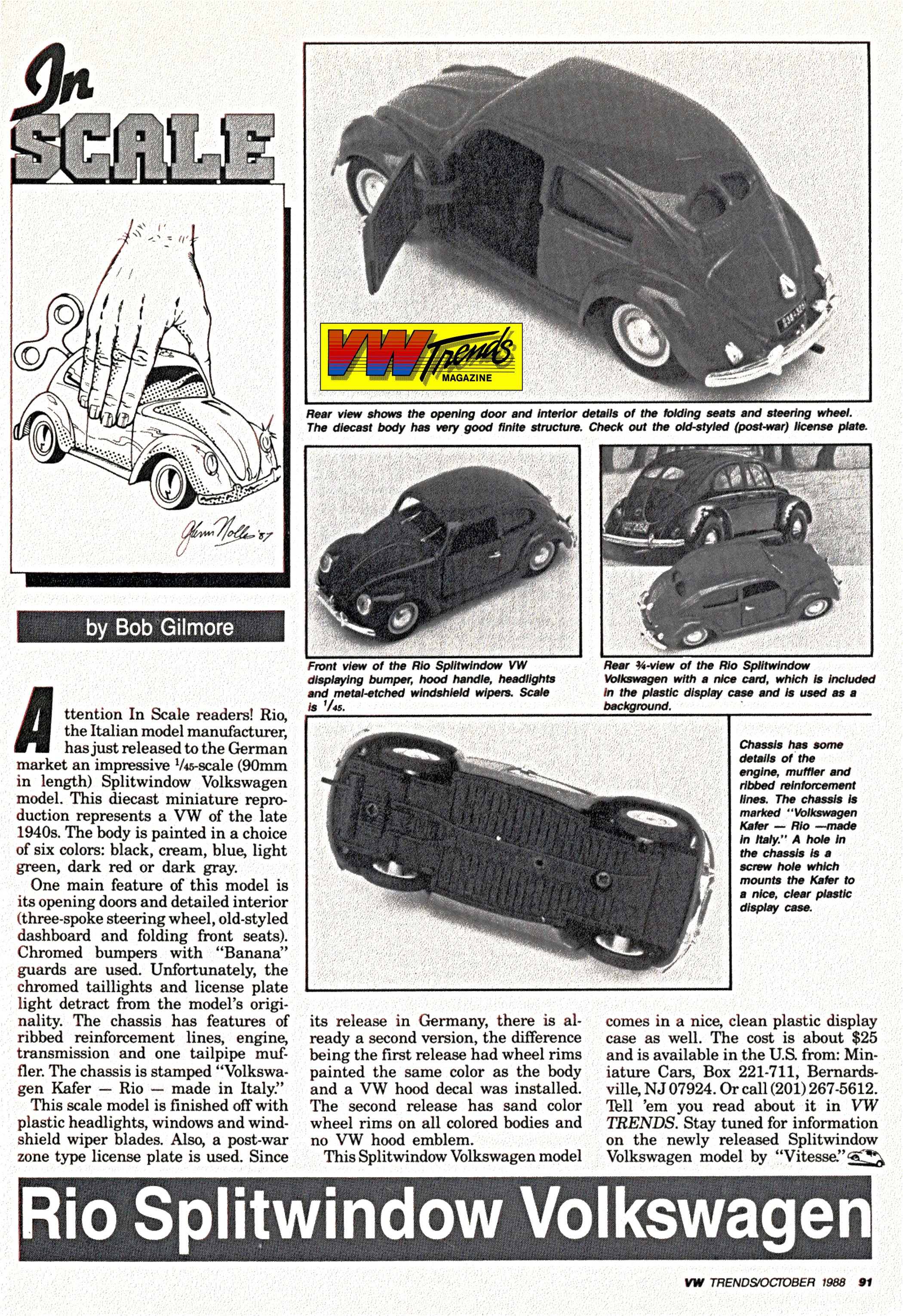 Attention In Scale readers! Rio, the Italian model manufacturer, has just released to the German market an impressive 1/45 scale (90mm in length) Split Window Volkswagen model. This dicast reproduction represents a VW of the late 1940s.