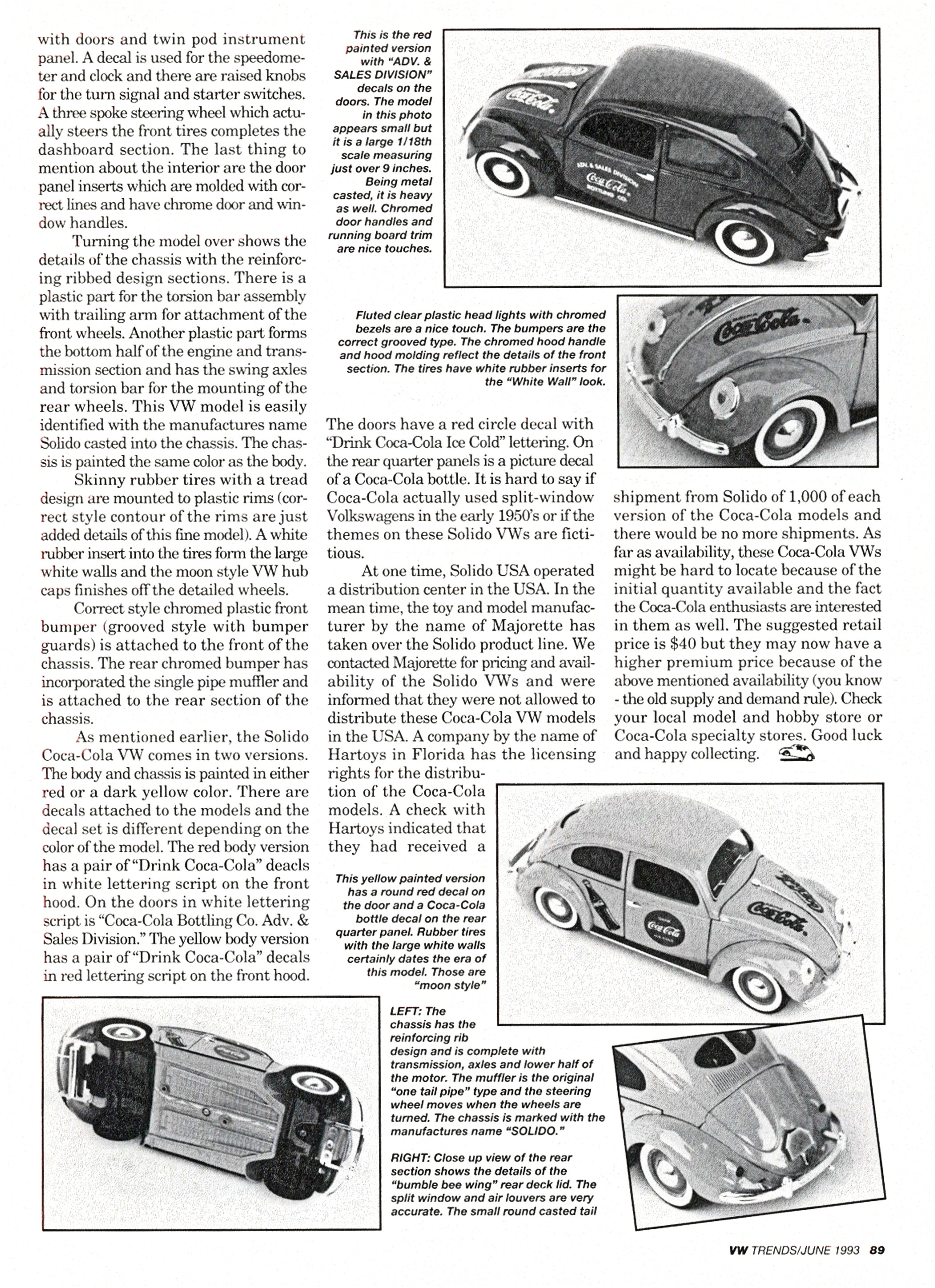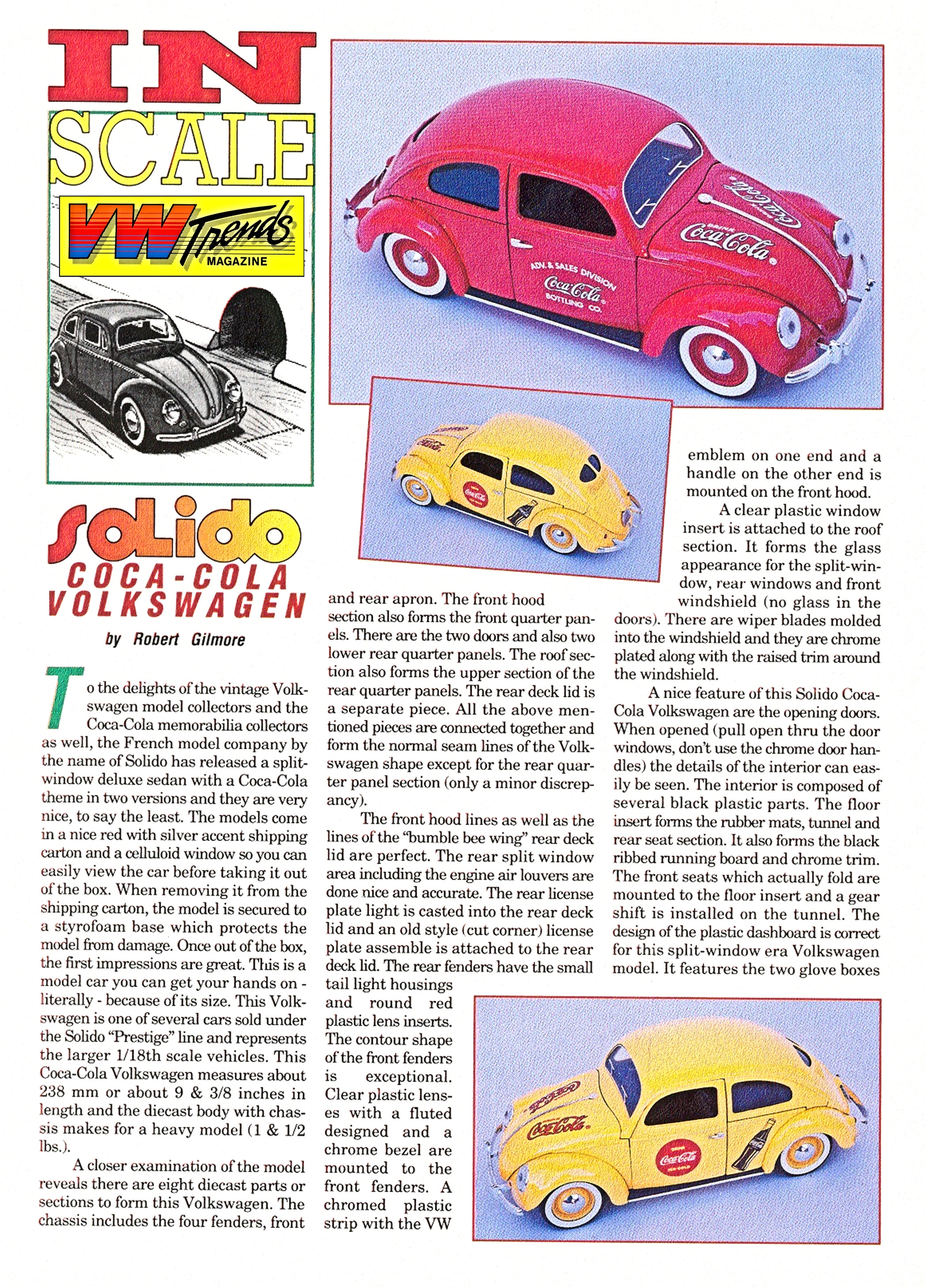 This COCA-COLA Volkswagen is one of several cars sold under the SOLIDO “PRESTIGE” line. This line represents the larger 1/18 scale vehicles. The Volkswagen measures about 238mm or about 9 inches and the diecast body and chassis makes for a heavy model.