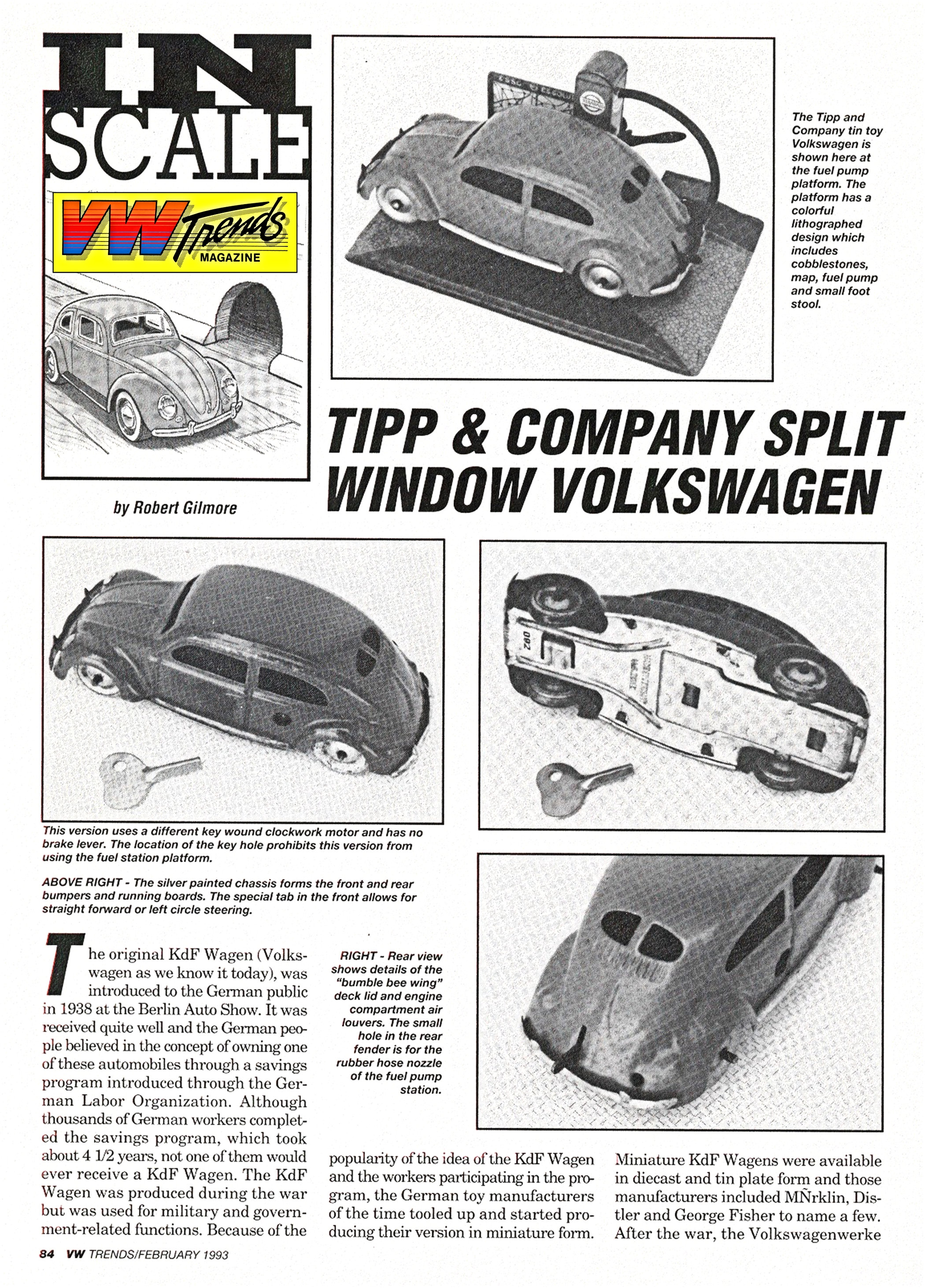 Nice stamping of a VW tinplate body with cut out windows, door seams, tin button headlights and indented air louvers. With or without clockwork motor with metal wheels, keyhole on passenger side (early) or on driver’s side (later). Tin plate chassis stamped “Made In Germany – U.S. Zone.”