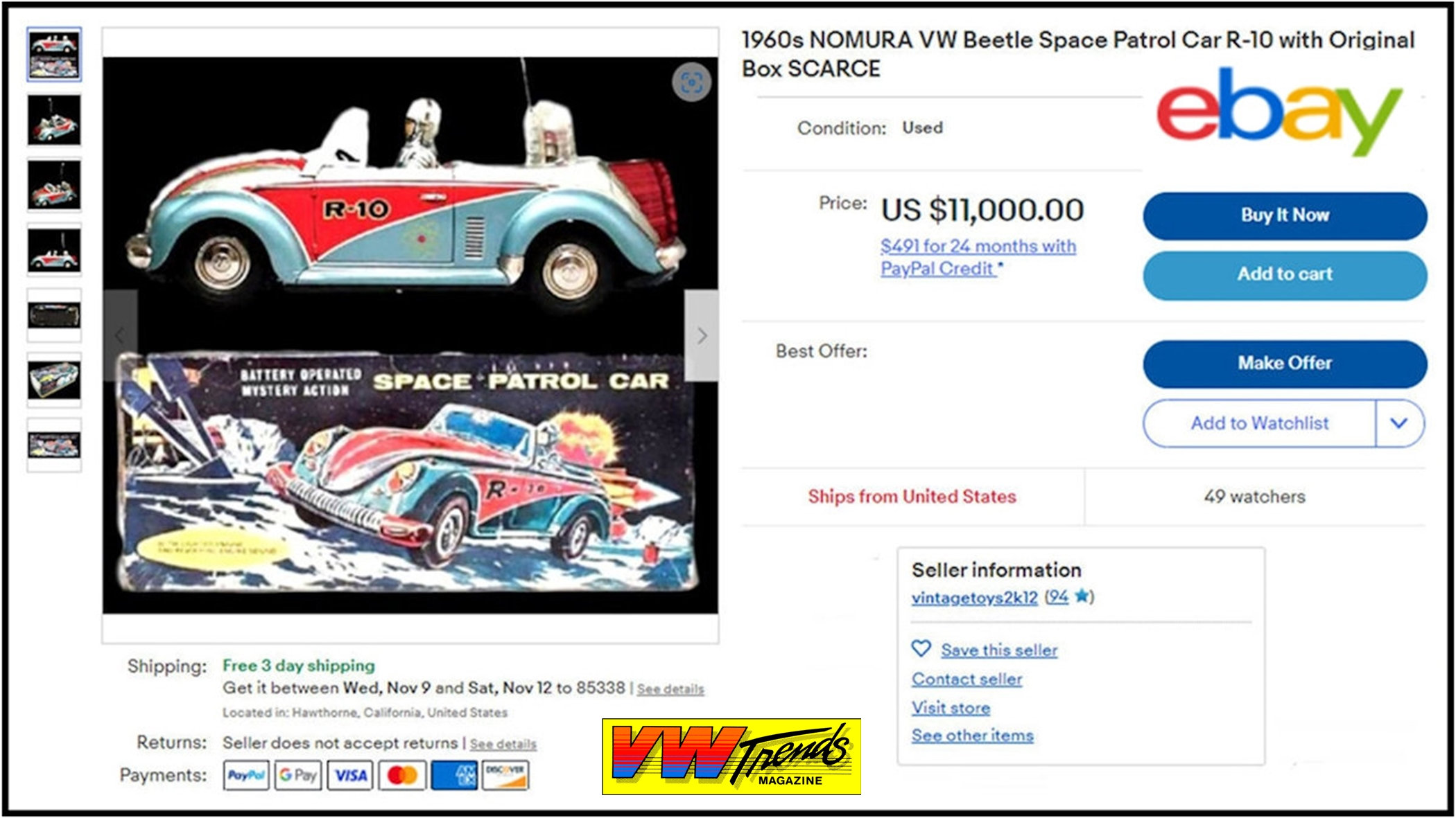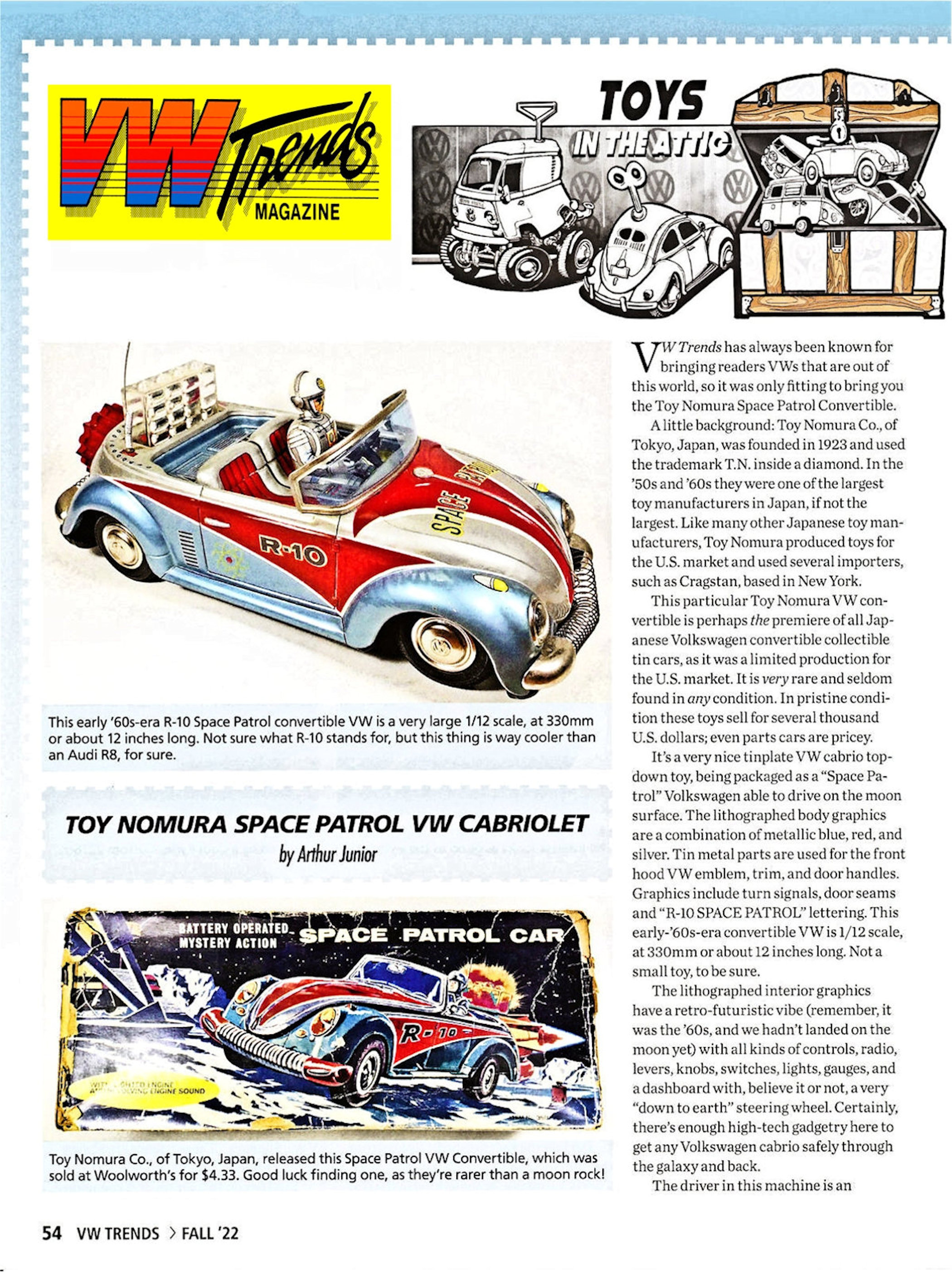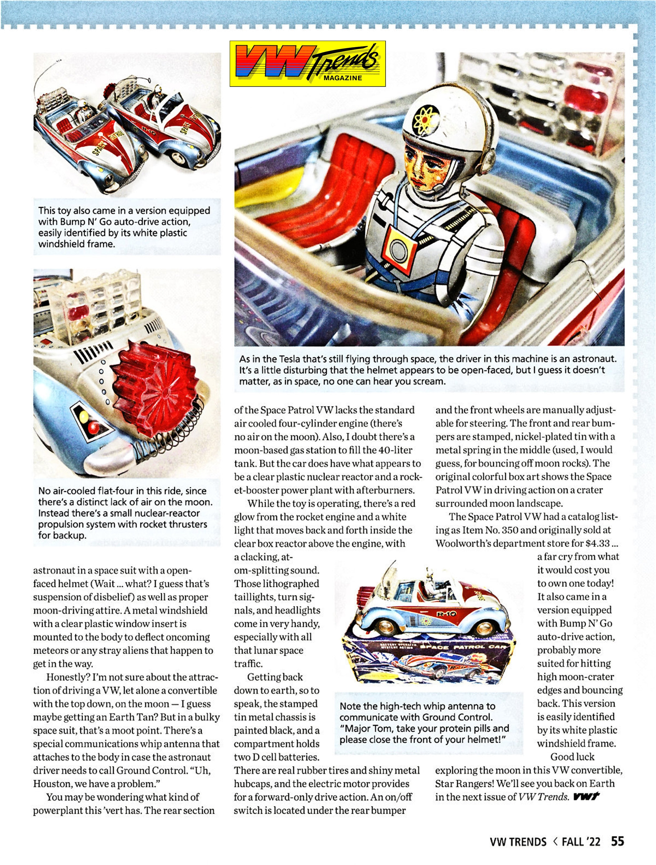 It represented a very nice tin plate VW cabrio toy with the top down depicting a “Space Patrol” Volkswagen car driving on the moon surface. If you could ever believe that! The lithograph VW body graphics are a combination of metallic blue, red and silver. Tin metal parts are used for the front hood VW emblem, trim and door handles.