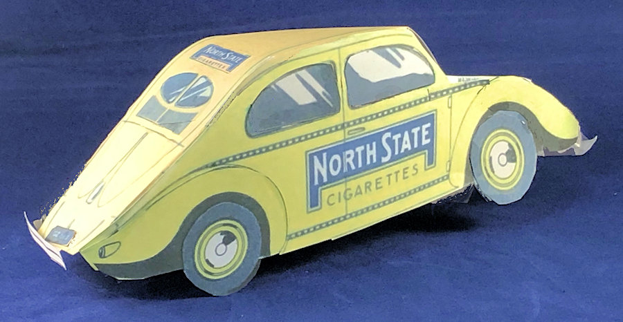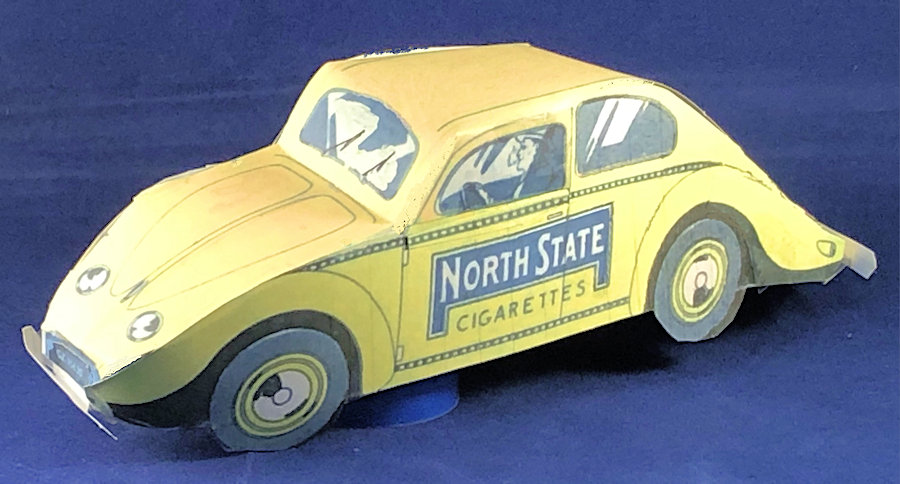 In the Netherlands, North State Cigarette, in the early 1950’s issued a yellow construction paper model of the Volkswagen Split Window Beetle for the tobacconists to display in their tobacco shop as advertisement material. The yellow colour and other design elements of the Split Window Beetle are the same as the colour and design of the cigarette packs. The tobacco dealer had to construct the paper display model themselves and they were not for sale for consumers. This makes them extremely difficult to find as these usually were used in the tobacco shop and then disposed of over time.