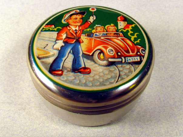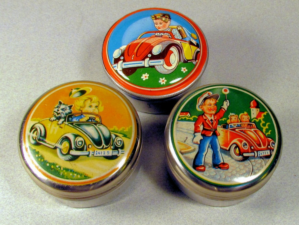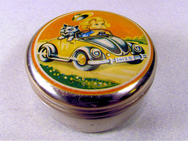In the early WWII post war years, to conserve paper, German school children all had little blackboards and chalk-like markers to complete their math and handwriting assignments. The well-equipped student also had a cloth and a little aluminum tin with a screw on top that were called a schwammdose. Inside the schwammdose was a wet sponge to erase and clean the blackboard. These schwammdoses came with a variety of themes for boys and girls and had various lithograph designs with everything from clowns to cowboys on the lid. But, lucky for VW collectors, some of them came with a Vintage Volkswagen theme and kids enjoying their VW Beetle Cabrio's lithographed on the schwammdose lid. There are no markings on these three VW Cabrio schwammdoses. From comparing them to other spardoses of the same time period, especially the lithograph artwork, they were definitely produced in the late 1940s - early 1950s and the manufacturer was no doubt Karl Rohrseitz GmbH & Co located in Zirndorf, Germany.
