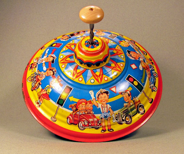 Karl Rohrseitz GmbH & Co produced a colorful spinning top that had graphics of a Cabrio VW with children and a dog inside. The top is marked "Made in Western Germany" - approximately 20cm in diameter and 20cm high.
