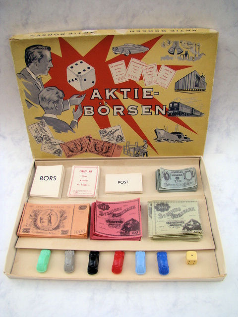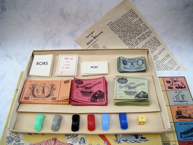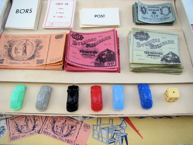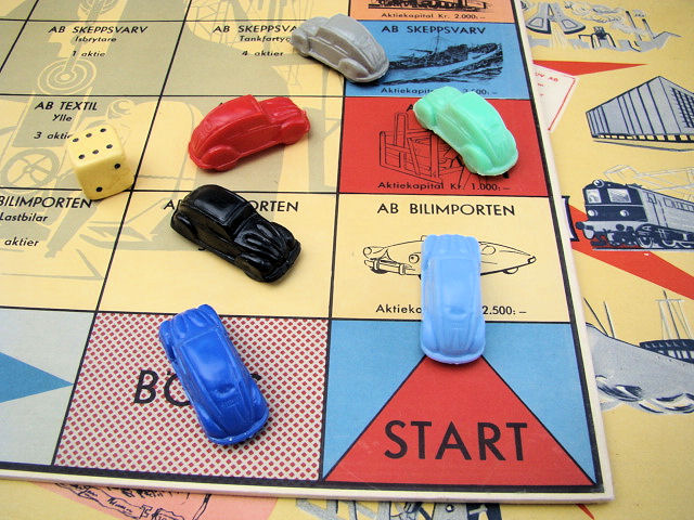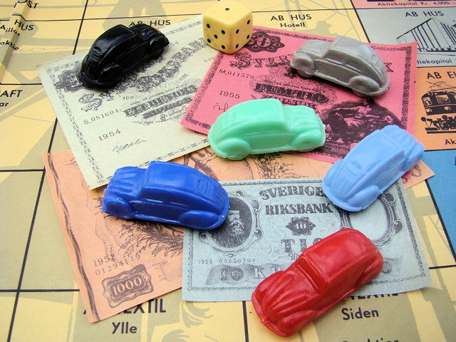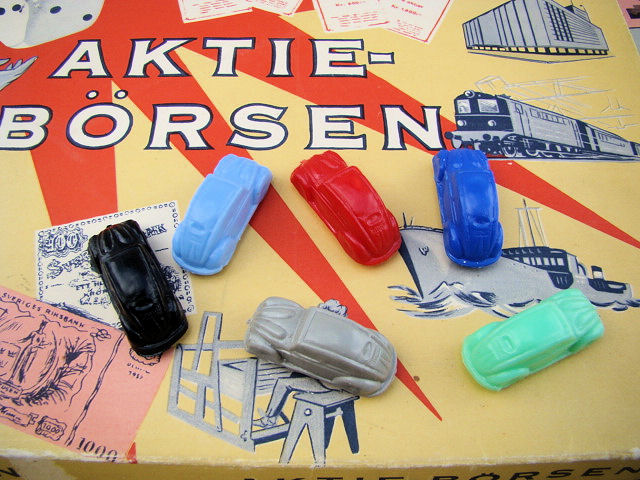A board game with special printed money, cards and a dice to roll. The game pieces are six small scale Oval Window VWs. The VWs are plastic with good details of the front hood, doors, rear oval window section. Plastic wheels are part of the body and there is a circle mold mark inside the roof. There are no manufacturer markings anywhere on the game set.