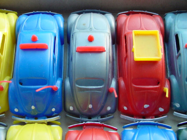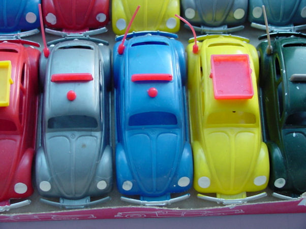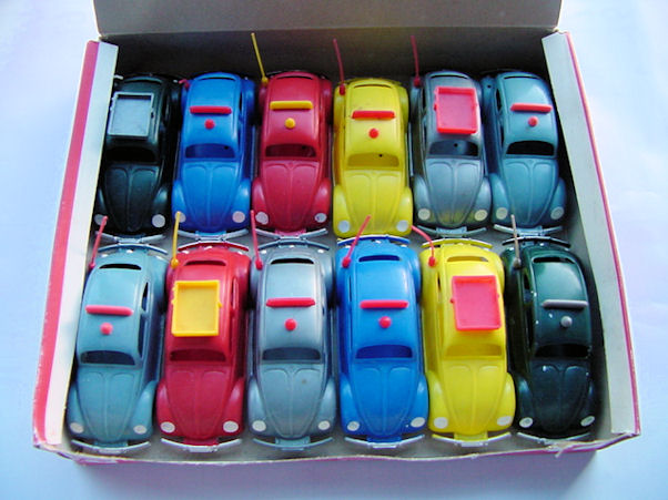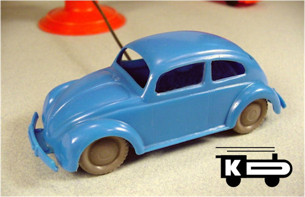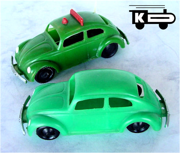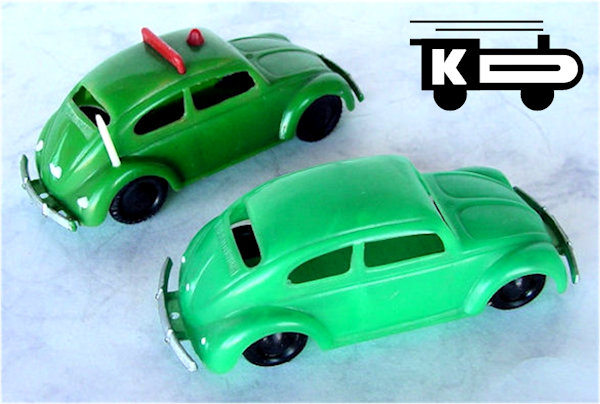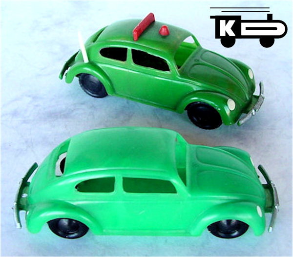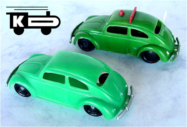 The Spielzeug/Blechspielzeug Company Konrad Dreßler (DRESSLER) founded in 1917, Fürth, Germany produced this plastic VW body with cut out windows and good details of front and rear hood, door seams and rear oval window with air louvers. Chassis molded in plastic, has a rib pattern, plastic wheels and bumpers. Either a plain body or with accessories items such as antenna, roof rack or siren.
