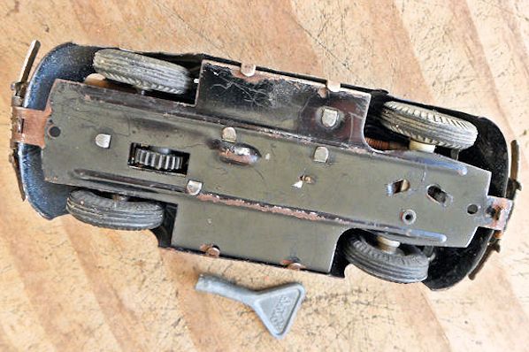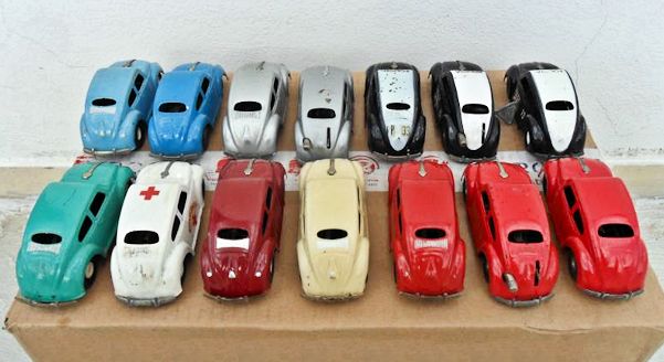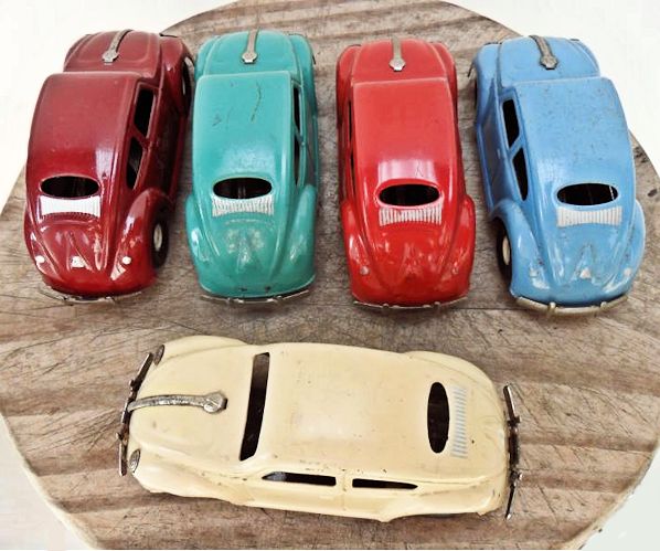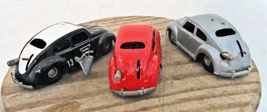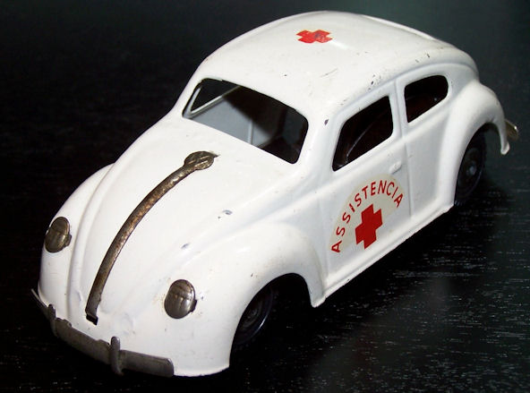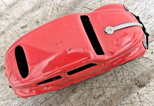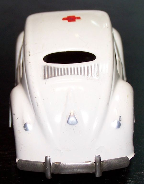 Tin body (slightly elongated) with cut out windows and good details of front and rear hood, door seams and rear oval window with 15 air louvers, usually painted silver. Also, with or without silver painted taillights and license plate light. Tin fluted headlights and front hood trim with the VW insignia. Tin stamped chassis, usually painted black, with friction motor and tin metal bumpers. The chassis attached to the body with 3 screws. No chassis markings. Sometimes mistaken for a German DUX Oval VW.