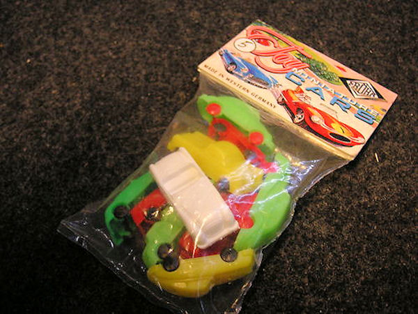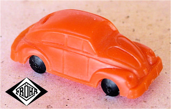 Plastic body with solid windows and fair details of front and rear hood, door seams and rear oval window with air louvers. No chassis and the black, white, red or yellow plastic axles and white wheels are mounted to the body pillars. This small oval beetle was sold by FRÖHA in plastic pouches mixed with different other makes of cars. The FRÖHA oval VW was furthermore used as a game piece for several board games. One of them was issued by the German ADAC in 1970 and was aimed at children to teach them traffic regulations.