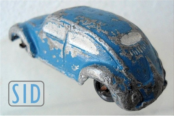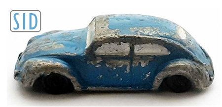 Solid white metal casted body with the resemblance of an Oval Window VW Sedan was produced by INDUSTRIAS SYDNEY (SID) Mexico. The casting is somewhat on the crude side but details of the front hood, rear hood, headlights, taillights, rear oval window and louvers can be seen. There is casted a VW emblem for the front hood. The front and rear bumpers with guards are also part of the body casting. There is a dab of silver paint for the headlights, front and rear bumpers as well. Metal axles with black plastic wheels are present and it appears that the thin metal chassis, holding them in place, is glued to the body. The chassis is stamped SID. Just to mention, SID also produced a top down Cabrio VW that was similar, see INDUSTRIAS SIDNEY SID VW CONVERTIBLE.