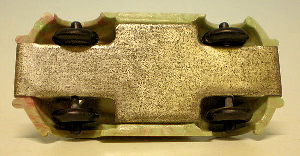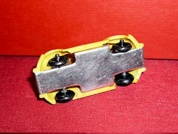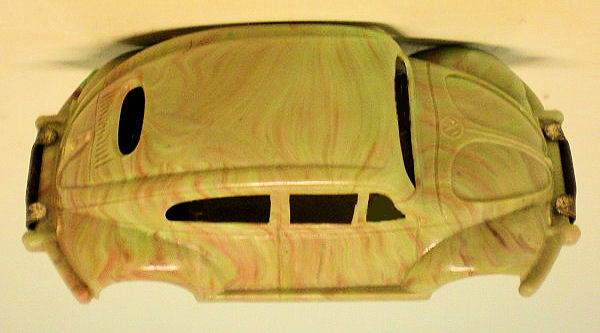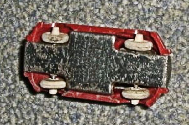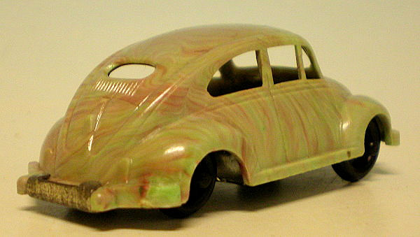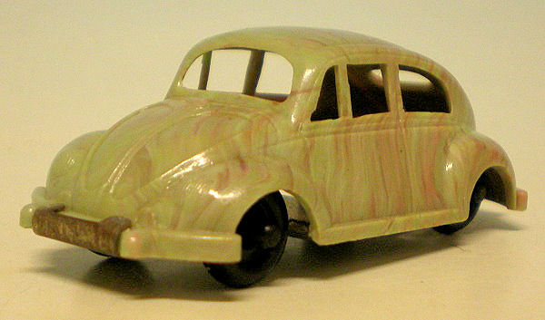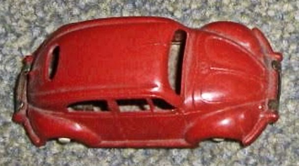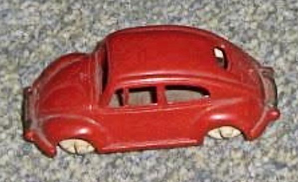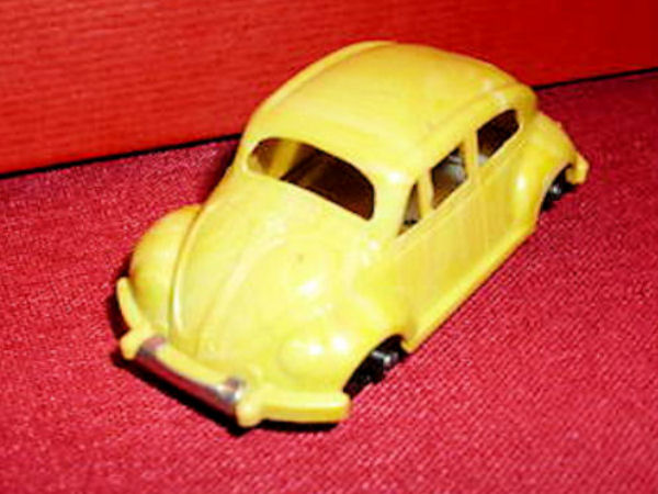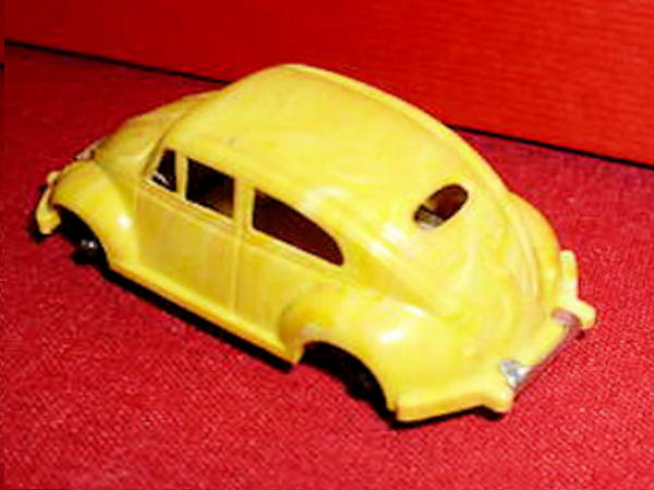 Version V1 of the LIMA MODELS Oval VW is a plastic body with cut out windows and fair details of front and rear hood and door seams. Molded front and rear bumpers, round horn grilles, VW hood emblem, trim and handle and taillights. Rear oval window is open with 15 air louvers. Aluminum chassis with black plastic wheels. Chassis has two metal tabs at each end that bend over the front and rear bumpers to secure the chassis to the body. No markings. Version V2 is similar without a metal chassis.