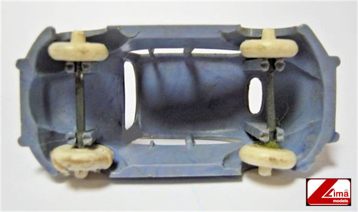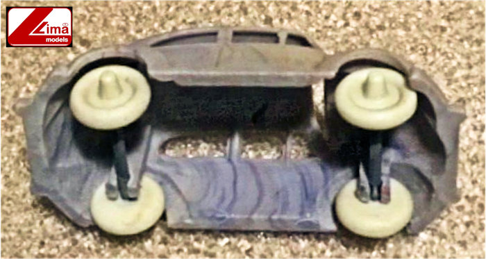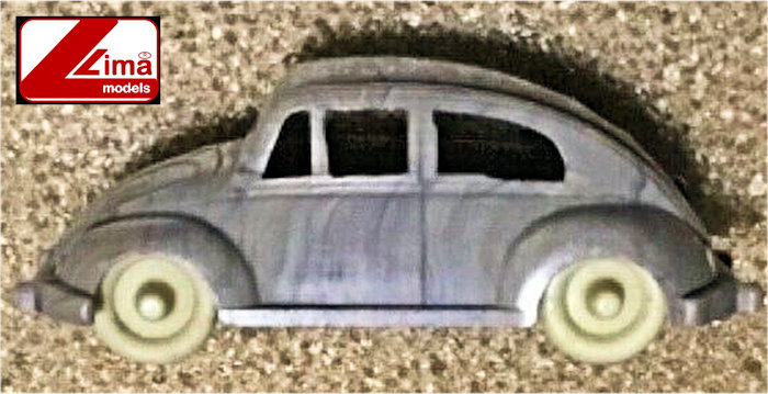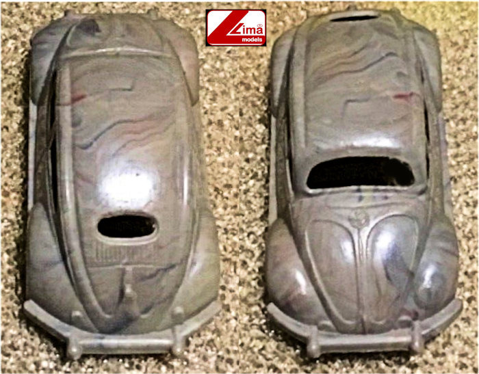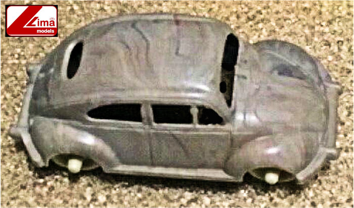 Version V2 of the LIMA MODELS Oval VW is a variegated light blue and white plastic body with cut out windows and fair details of front and rear hood and door seams. Molded front and rear bumpers, round horn grilles, VW hood emblem, trim and handle and taillights. Rear oval window is open with 15 air louvers. No chassis and plastic pillars hold the metal axles and plastic wheels with pointed hubcaps are attached to the axles. No markings.