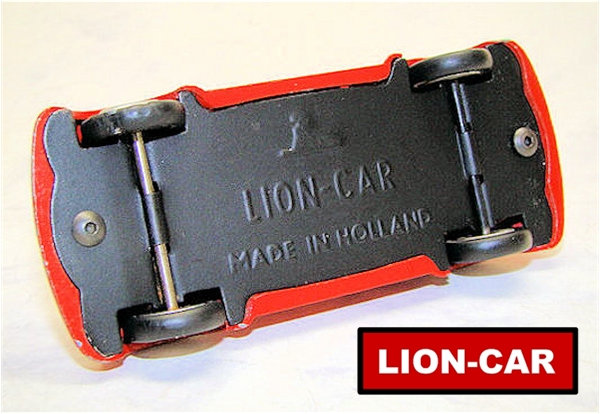 Diecast metal body with solid windows and good details of front and rear hood, door seams and rear oval window with air louvers. Metal axles with diecast rims with rubber tires. Metal chassis stamped LION CAR, MADE IN HOLLAND (when produced in Holland) and no motor.
