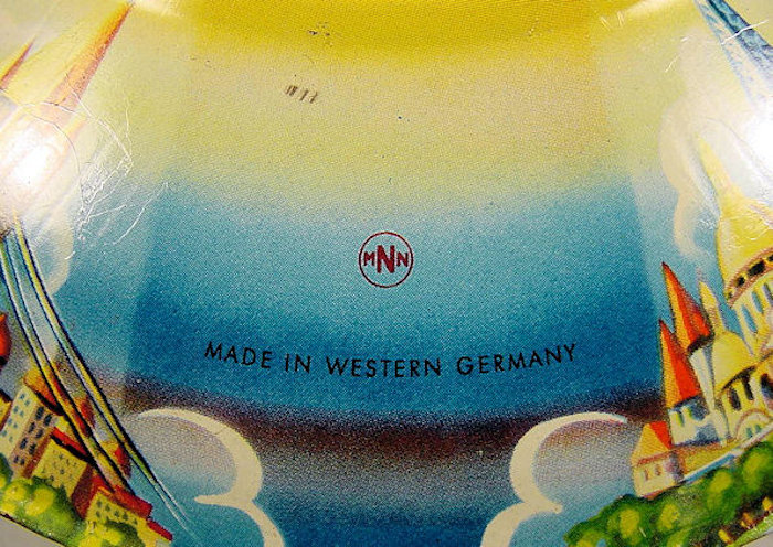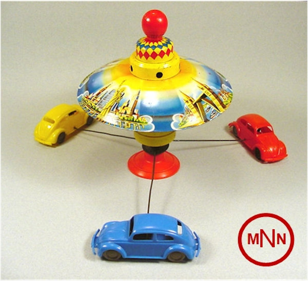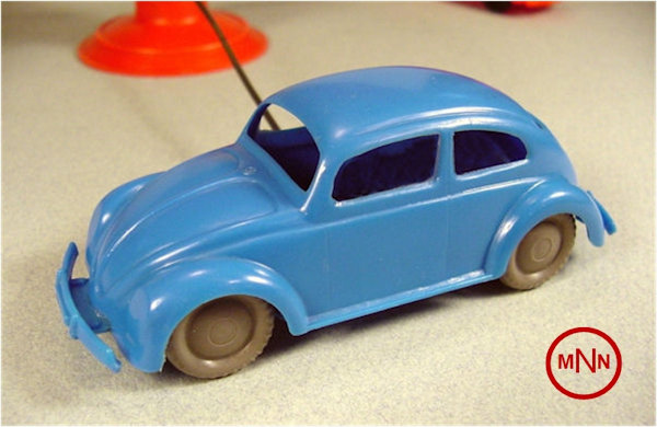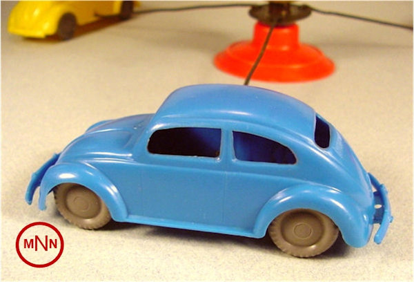 Michael Nüsslein Fahrzeug Aufbauten GmbH from Nürnberg, Germany produced this spinning top with colorful lithograph landmark scenes of New York, London, Paris and Taj Mahal. The top has three metal arms with DRESSLER Oval Window VWs that spin around the base as the top spins. The VWs have a plastic body with cut out windows and good details of front and rear hood, door seams and rear oval window with air louvers. Chassis molded in plastic, has a rib pattern, plastic wheels and bumpers. Markings in lithograph: Company Logo “MNN” and "Made in Western Germany". These markings are also molded into the underside of the hollow red base. Action: repeated movement of the handle up and down causes the top to spin creating an audible musical hum. The cars and rods move in a circle with the top at a slower, simulated, normal driving speed. See also the DRESSLER listing!