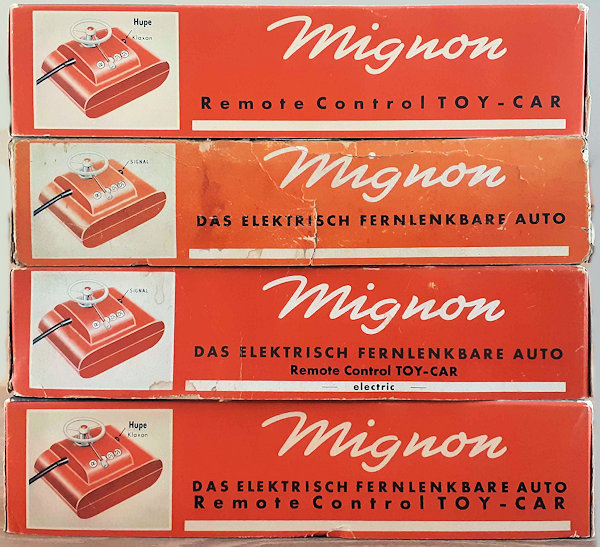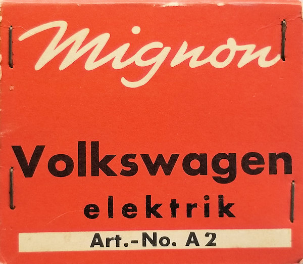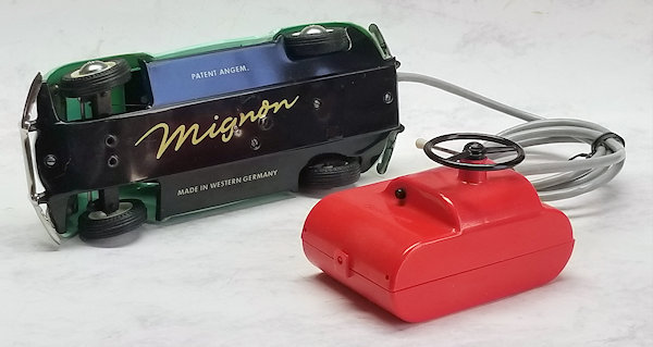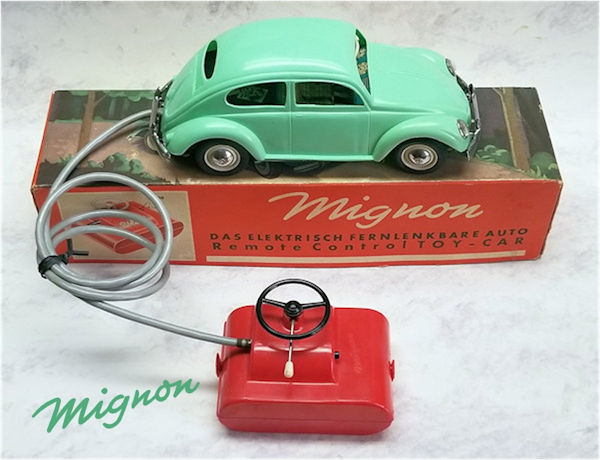 This remote control Oval Window VW was produced by R. & W. Link from Schwenningen under the brand name MIGNON. LINK bought in 1951 the name and trademark “MIGNON” of the Staiger Company. LINK started producing the toys with cable steering. LINK was in principle a mechanical company, produced the tin parts themselves as well as the technical parts of a toy. The body was bought from other manufacturers: the Oval VW had an Arnold body. R&W LINK / MIGNON did not advertise anymore after 1957. It is unclear when the Company ceased to exists. Most probably that was around 1958/1959.