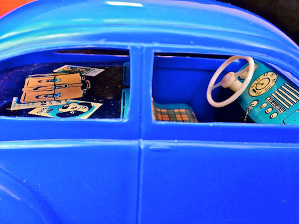 The soft plastic body appeared with cut out windows and very good details of front and rear hood, door seams and rear oval window with air louvers. This V3 version also had a formed tin interior with a colorful, non VW, lithographed interior and steering wheel. The remote control VWs came in a colorful box with graphics of a VW and road signs.