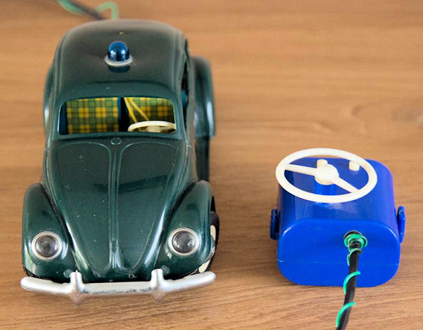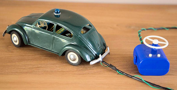 There is also a POLIZEI MIGNON Oval VW with a dark green plastic body with a blue emergency light mounted on top of the roof. The control box is a blue color with a white steering wheel and an additional green wire wrapped round the remote cable for the blue light operation. Chassis is not marked and is seldom found.