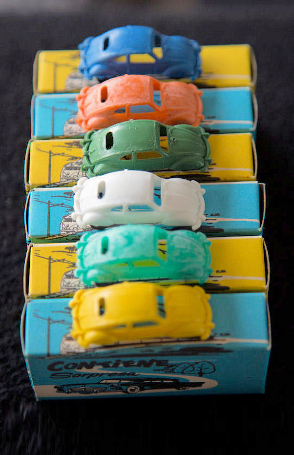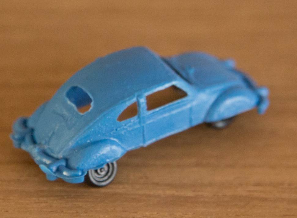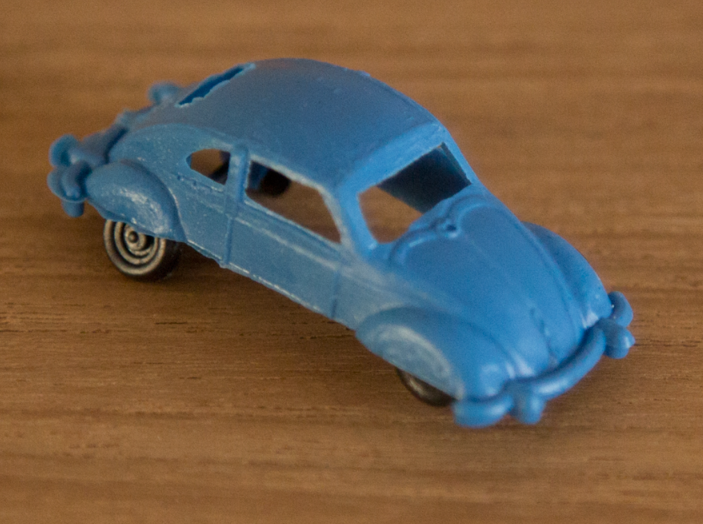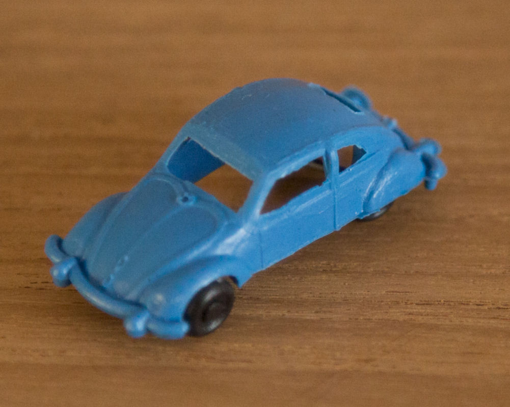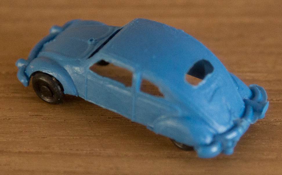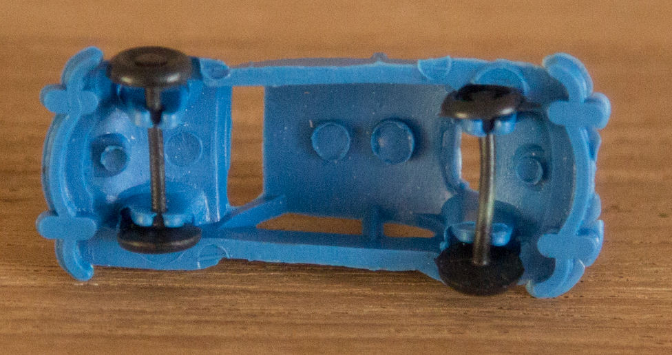 Produced by ESplugas de Llobregat in Barcelona (Montaplex). Plastic body with cutout windows and fair details of front and rear hood, door seams and rear oval window with air louvers. Bumpers are molded as part of the body. No chassis and the black plastic axles and wheels are attached to the body pillars. There are five round mold marks, two under the front hood, two under the roof and one under the rear deck lid. No other markings.