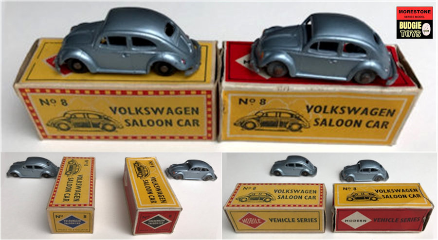 Diecast metal body with cut out windows and good details of front and rear hood, door seams and oval window with air louvers. Chassis made of metal and marked Made in England – Volkswagen Sedan no.8. The MORESTONE series consisted of twenty different diecast miniature toy vehicles, including a VW Sedan (NO. 8) and VW Microbus (NO. 12). The wheels were diecast metal mounted on axles with crimped ends. Later, grey and plastic black wheels were also used. The MORESTONE Series was to compete with the popular Matchbox Toy series during the mid 1950s. The BUDGIE and MORESTONE VWs are often mistaken and called a "MATCHBOX" VW toy.The MORESTONE VWs were also sold in the US under the name of TWIRL TOWN TOYS (Colorado, US) and THRIFT TOYS.