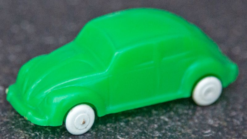 A soft plastic body in the shape of an Oval Window VW Sedan that has solid windows and good details of front and rear hood, door seams and rear oval window. The front and rear bumpers are part of the body mold. No chassis and the white plastic wheels and axles are clipped onto the body. The axles seem to be quite large for the Oval VW, but this is original. It came in a series of 6 different cars. Inside the roof is marked VW and some are marked OMO which is a detergent Company as the toys were a promotional give a way. Although the actual manufacturer is unknown, this VW is listed under the OMO name as some of the cars have OMO inside the roof.