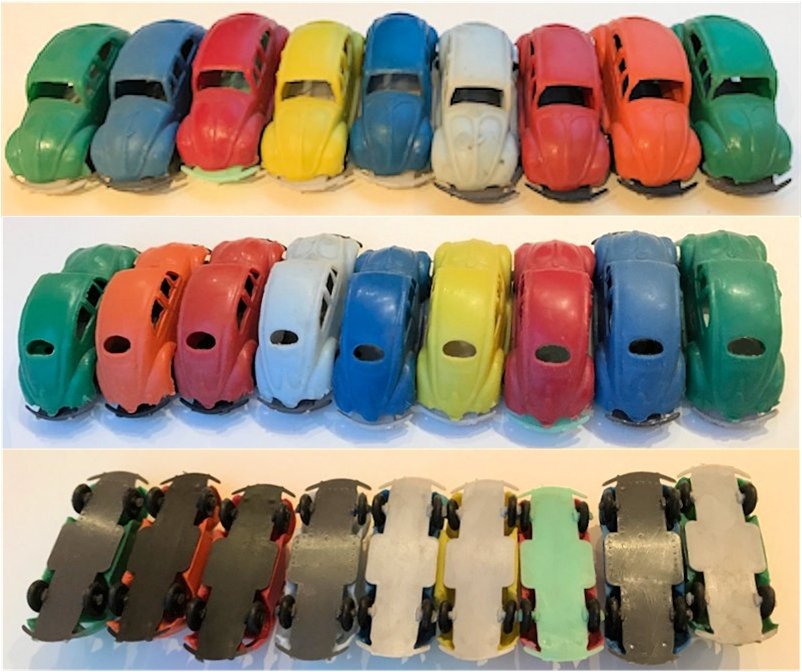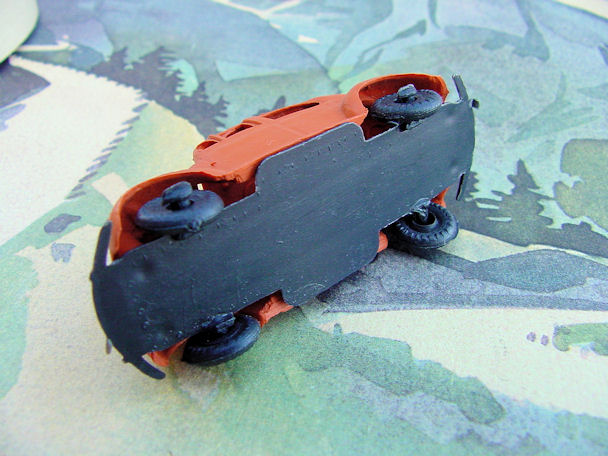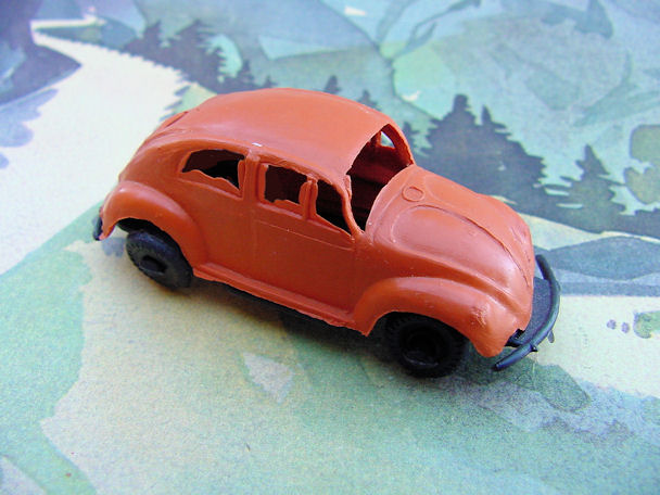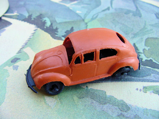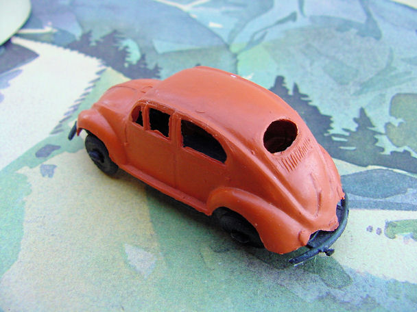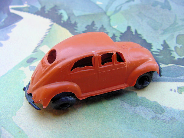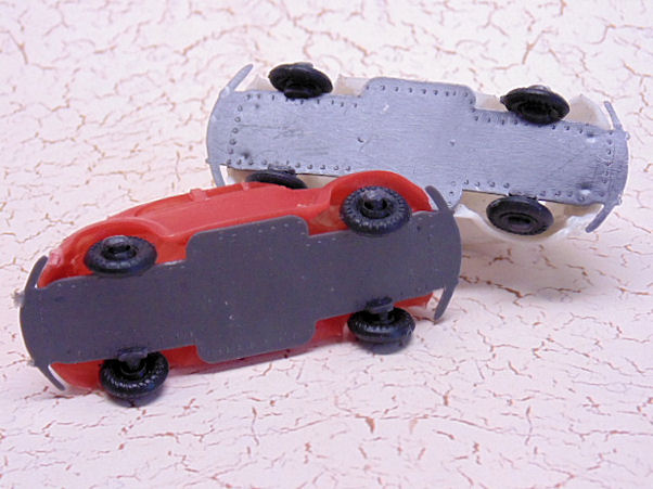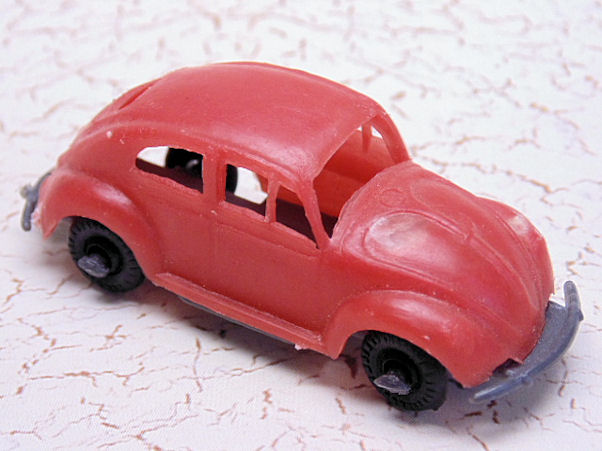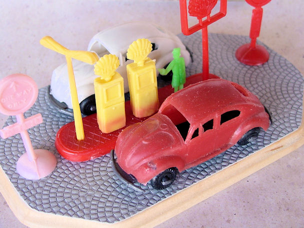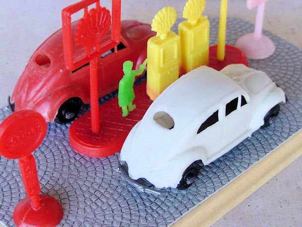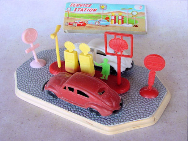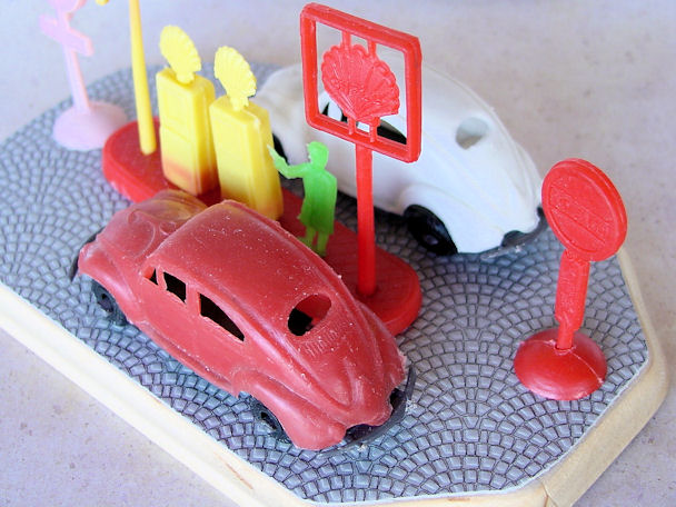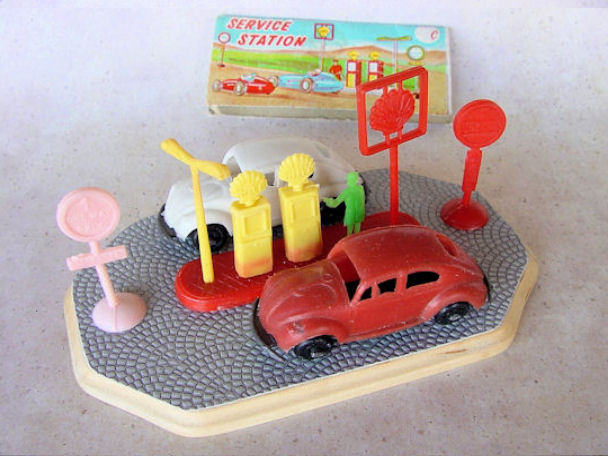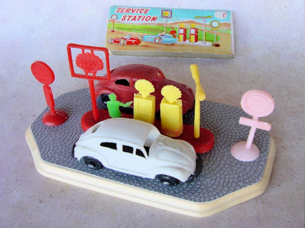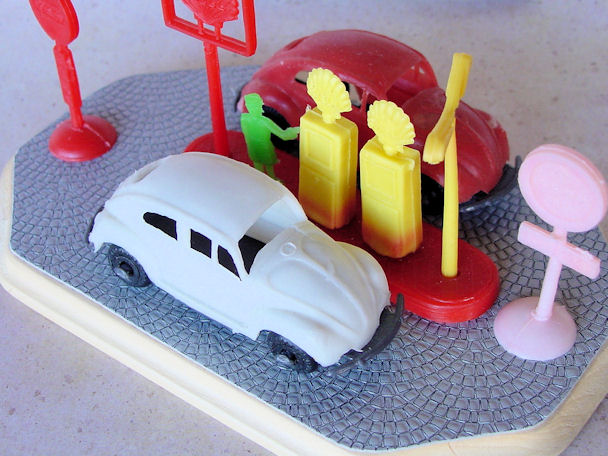Plastic body with cut out windows and fair details of front and rear hood, door seams and rear oval window with air louvers. Chassis molded in grey plastic and black plastic wheels attached to the chassis. Chassis has dots around the edge like little rivets. Part of a filling station set with pumps, signs and station attendant. Believed to be produced by PH, Paya Hermanos.