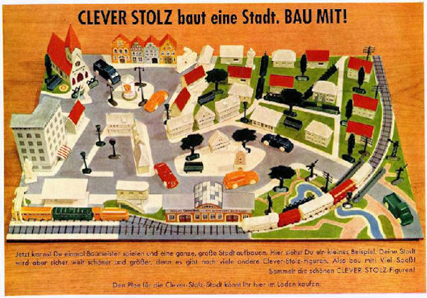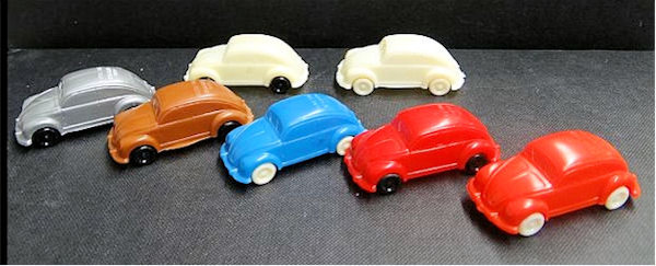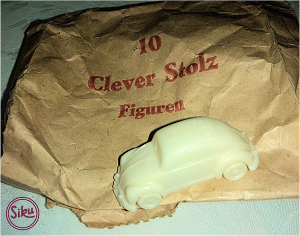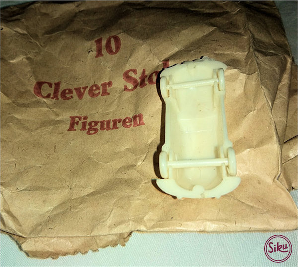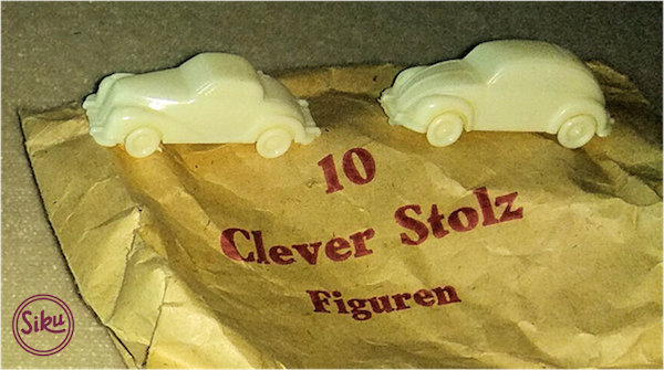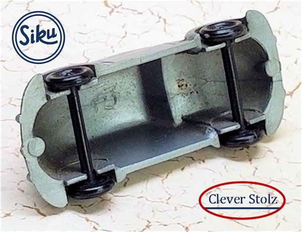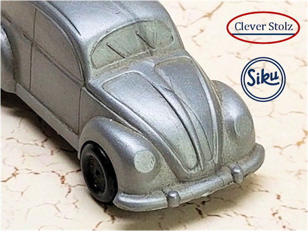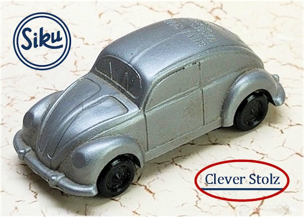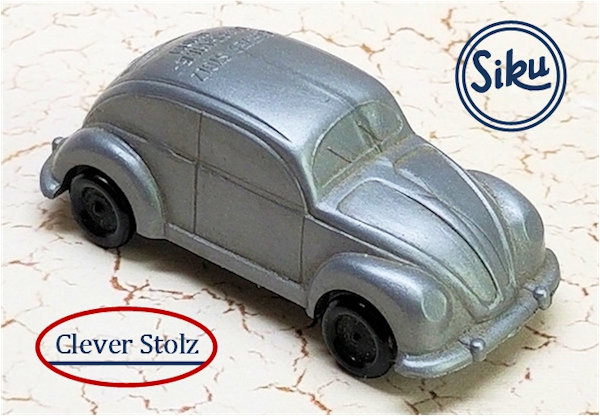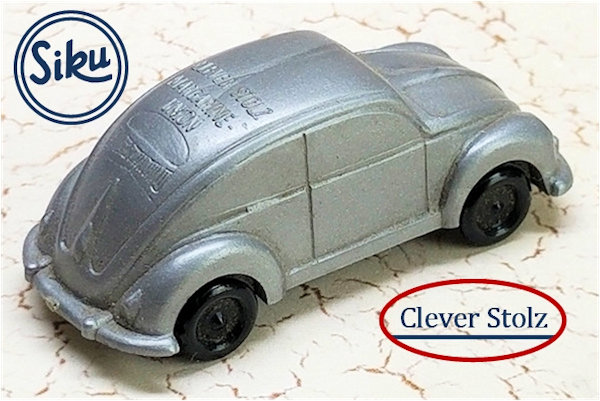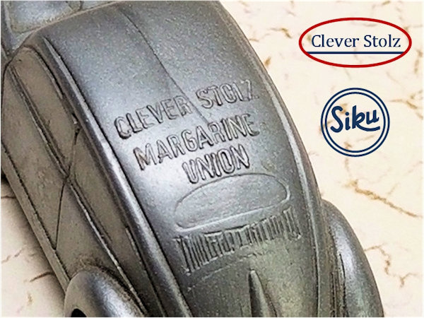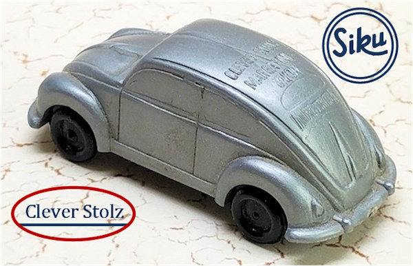 SIKU produced this promotional VW with a plastic body with solid windows and good details of front and rear hood, door seams and rear oval window with air louvers. Light impressions of the rear window and louvers. No chassis and the black or white plastic wheels snap onto the body pillars. There is a round mold mark under each bumper. On the roof is the lettering of “CLEVER STOLZ MARGARINE UNION”. There is also a version with "Ada Ada" lettering. The model is also issued without lettering - see SIKU OVAL VW V3. Also available was a cardboard city plan that you could buy and play with your CLEVER STOLZ toy cars.