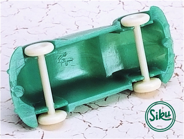 SIKU produced this promotional VW with a plastic body with solid windows and good details of front and rear hood, door seams and rear oval window with air louvers. Light impressions of the rear window and louvers. No chassis and the black or white plastic wheels snap onto the body pillars. There is a round mold mark under each bumper. No roof lettering. This version is the same as SIKU (CLEVER STOLZ) OVAL VW V2 but without Clever Stolz markings and were sold in little bags of plastic cars. This was NOT the manufacturer, but the Margarine Company that used the toy to promote their products.