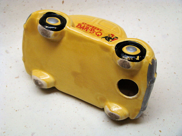 St. Hubert is a leading force in the Quebec restaurant business. The first St. Hubert restaurant opened its doors on September 25, 1951 on St. Hubert Street in Montreal, Canada. For years, their fleet of yellow VW Beetles criss-cross Montreal's streets, delivering delicious St. Hubert chicken at no extra cost. The little yellow 5 ½ inch ceramic Oval Window VW ashtray cars were sold for $1 in the 1950s, on delivery to promote their delivery service.