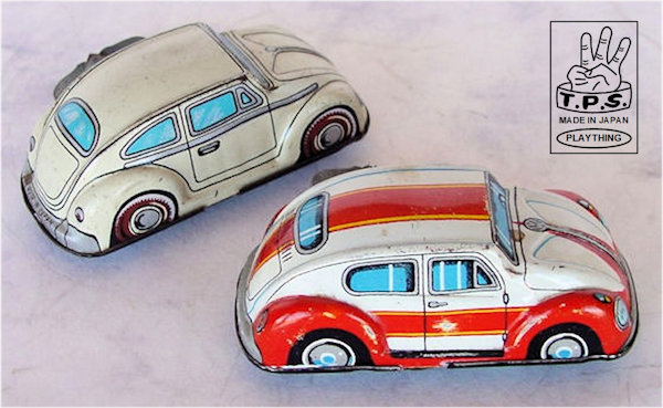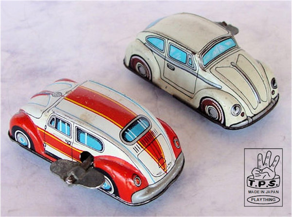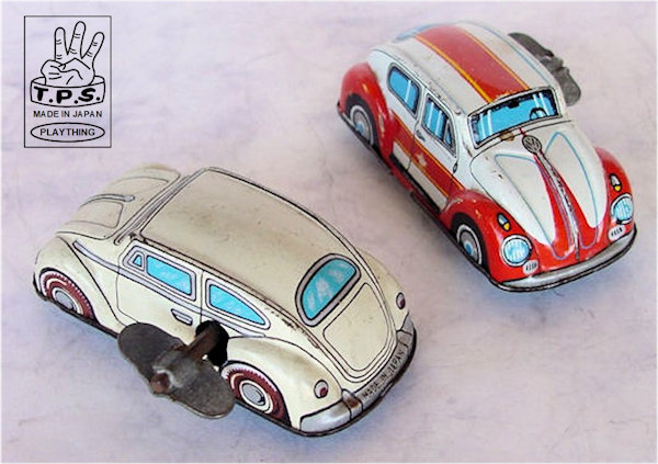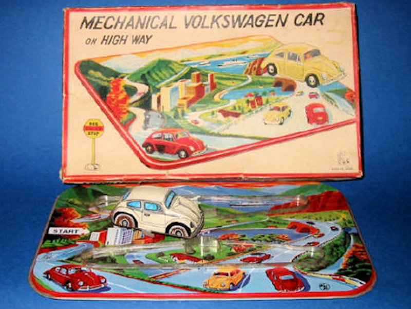 They produced a colorful lithographed track set with an Oval Window VW toy. The tin body has a very nice detailed multicolored lithograph VW design. Tin chassis with a key wound motor. Some of the tin VWs have a removable key and special side skids on the chassis to help keep the VW on the track. Some have a fixed key and no side skids and may be used for a no track setup.