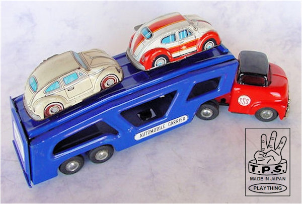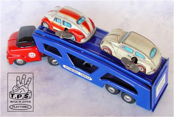 Tokyo Plaything Shokai Co., Ltd (initially Toplay ltd) was founded in 1956 in Tokyo, Japan and ceased to exist in or around 1975. The company logo with the 3 fingers symbolises the 3 company founders; Yoshio Udagawa, Yukio Miyakawa and Yasuo Kushida. They mainly produced lithographed colorful tin toys. Like other Japanese manufacturers, they also produced for different US toy importers, like Linemar, Cragstan and others. These toys and their boxes often (but not always) did not carry the TPS name or logo, which makes it difficult to identify them.