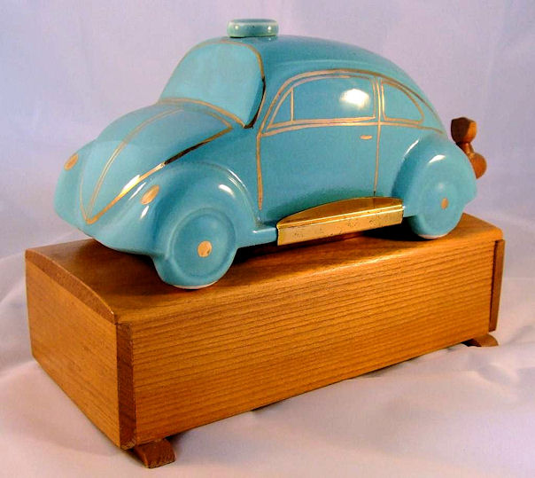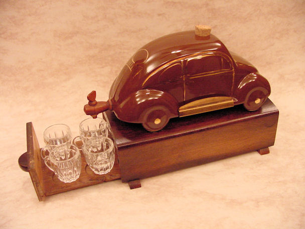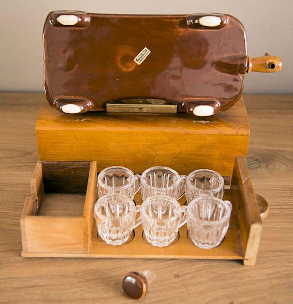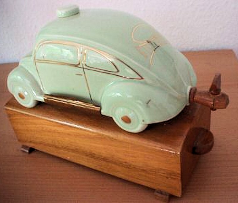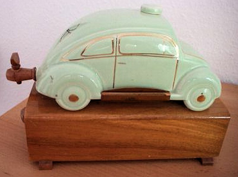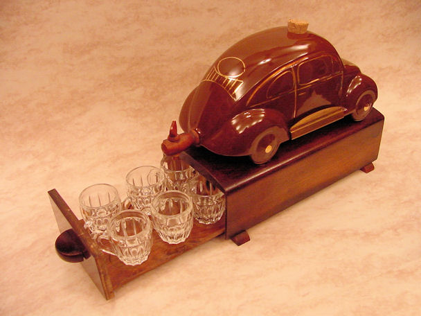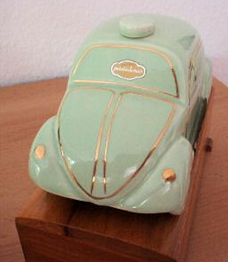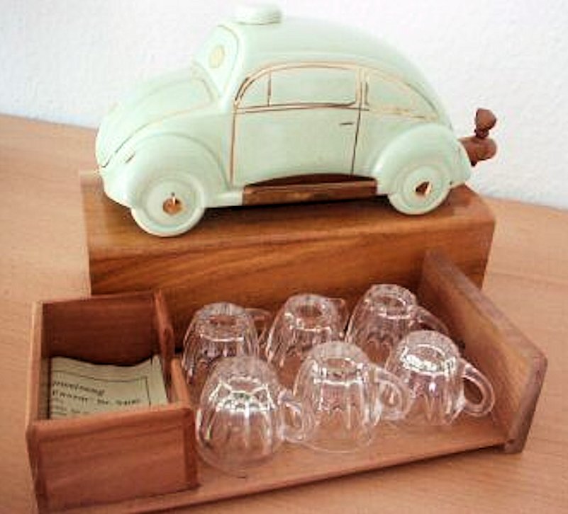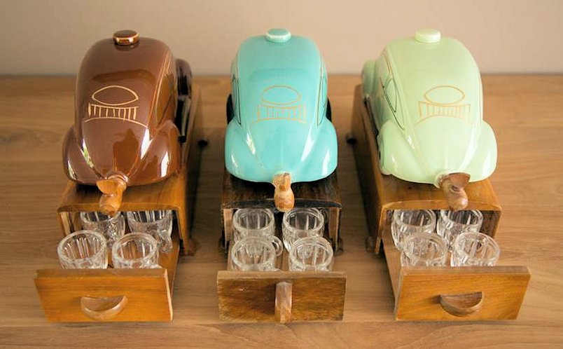 A VW shaped porcelain container with a wooden tap at the rear and filler hole on the top. Oval Window VW details outlined in gold color. Mounted on a wooden box with a drawer containing six liquor glasses and a space for a pack of cigarettes. Sometimes has a “FABRIQUE EN ALLEMAGNE” sticker on the bottom and “peint al a main” sticker on the windshield.