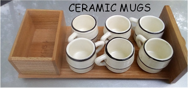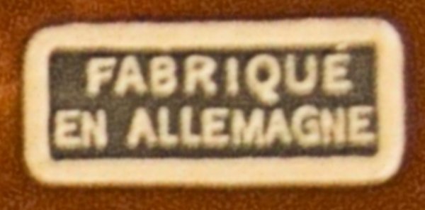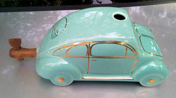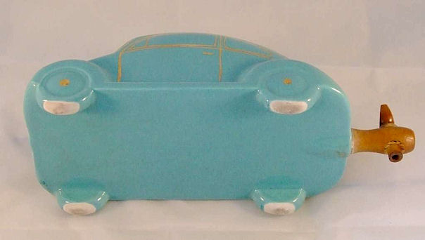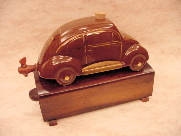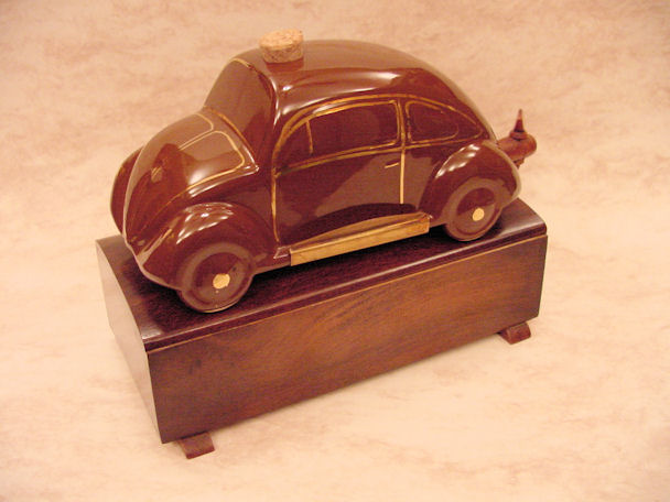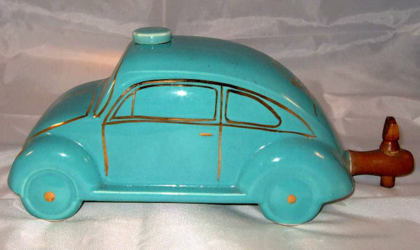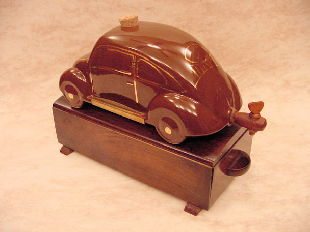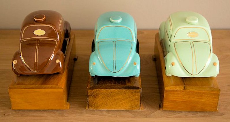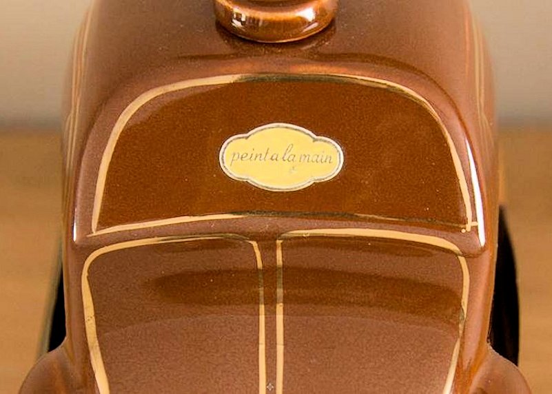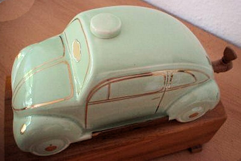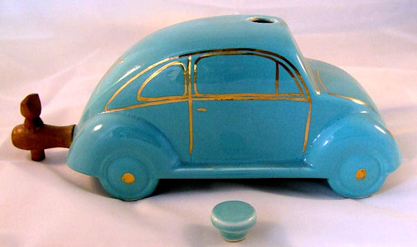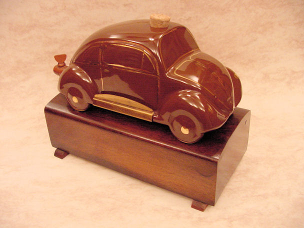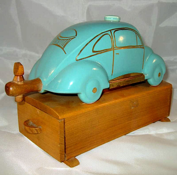 A VW shaped porcelain container with a wooden tap at the rear and filler hole on the top. Oval Window VW details outlined in gold color. Mounted on a wooden box with a drawer containing six liquor glasses and a space for a pack of cigarettes. Sometimes has a “FABRIQUE EN ALLEMAGNE” sticker on the bottom and “peint al a main” sticker on the windshield.