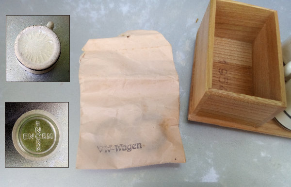 Enclosed is also a paper bag with 'VW Wagen", most probably to store the plastic spare corks with the name of the liquor company 'Enorm'. The original porcelain 'cork' is also included and painted in the same color as the decanter.