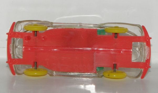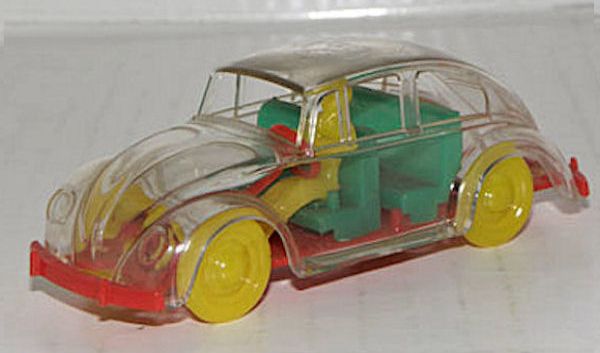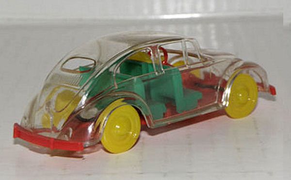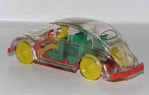 Very detailed plastic body with cut out windows and VW emblem on front hood. Red plastic chassis contained separate parts to include green seats, yellow driver and a red steering wheel. There is no spare tire, gas tank or engine/transmission. Yellow plastic wheels/hub caps attach to the chassis. Was sold as a constructional kit. The Persian script on the roof translates to “Store Ferdowsi – Tehran”. It therefore most probably is either a promotional item for this store, or it was sold by this store. The WIKING constructional kit concept was often copied by other manufacturers but never duplicated in the quality of the German WIKING process.