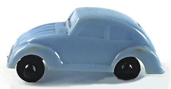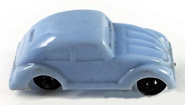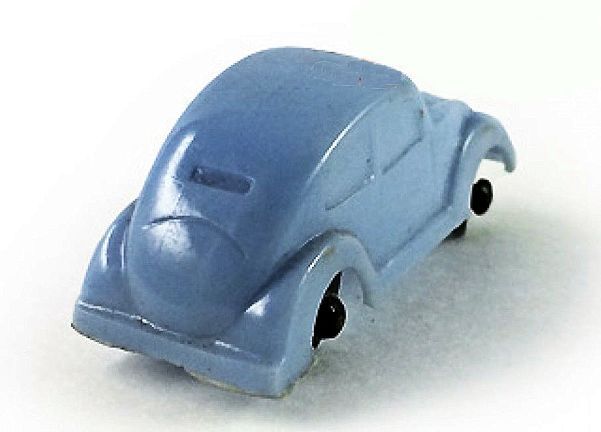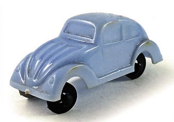 Plastic body with solid windows and good details of front and rear hood, headlights and bumpers. The rear oval window is small and a rectangle shape. There is a curve in the body molding to represent the rear deck lid. No chassis and the black plastic axles and wheels are attached to the body pillars. The little VW was a promotional given with candy.