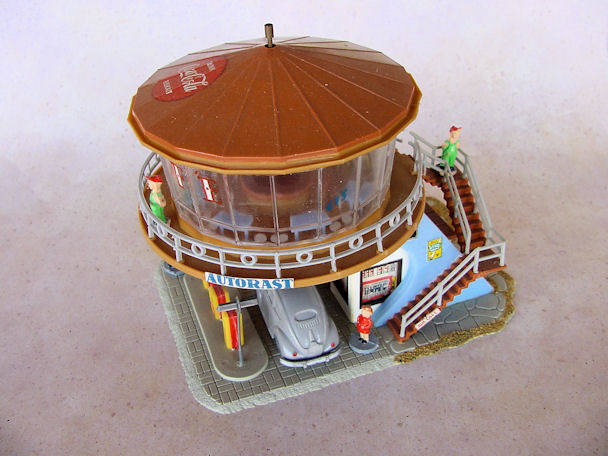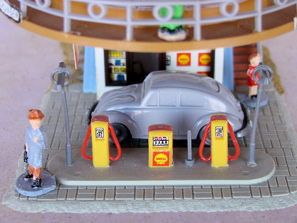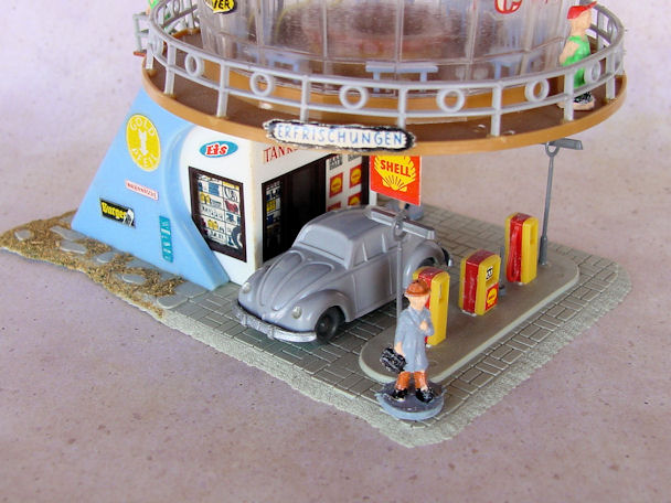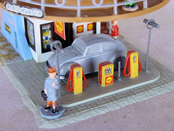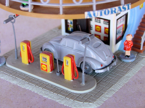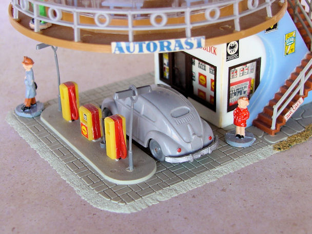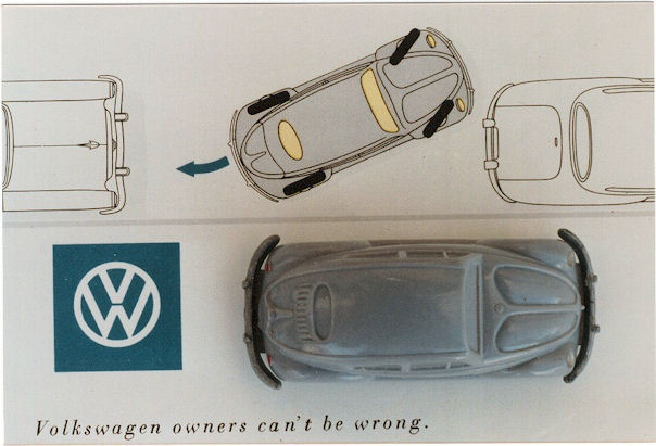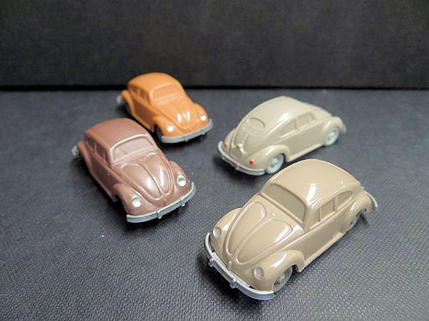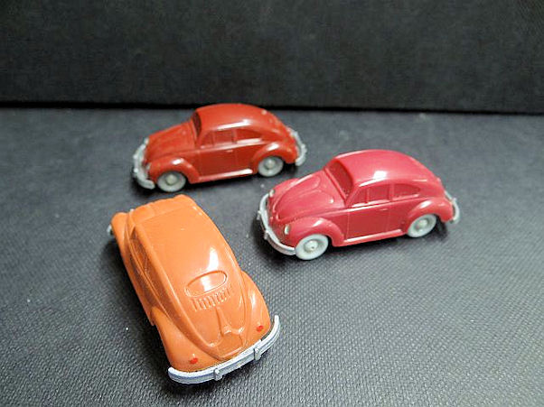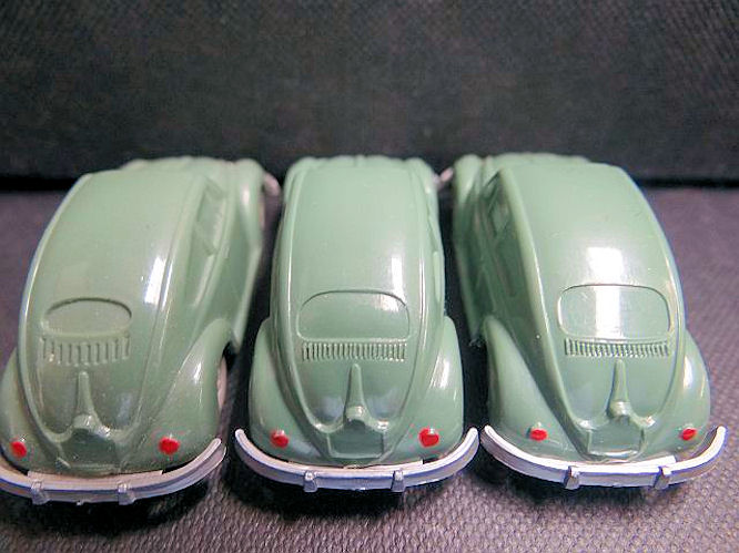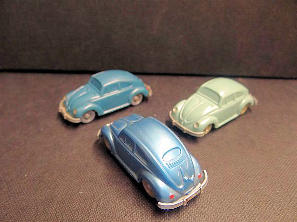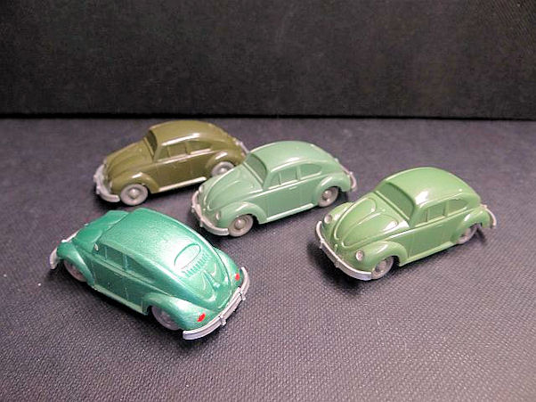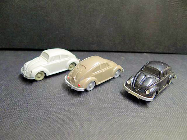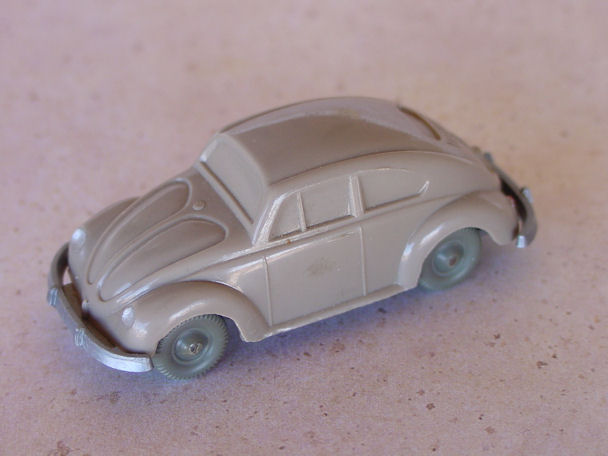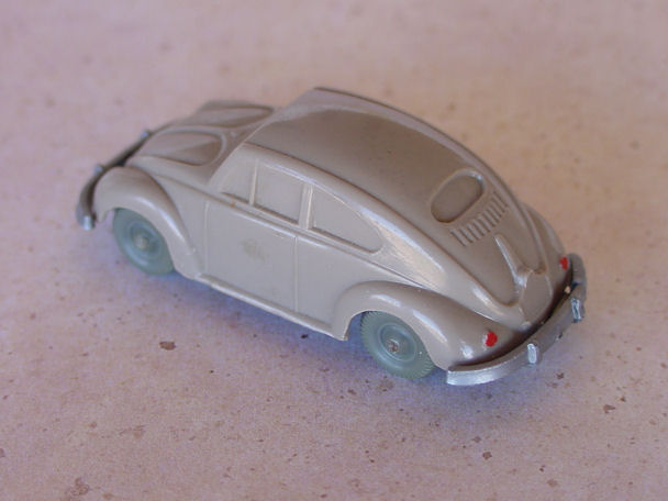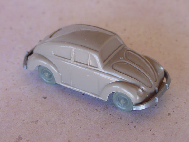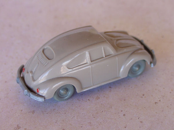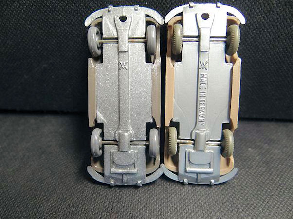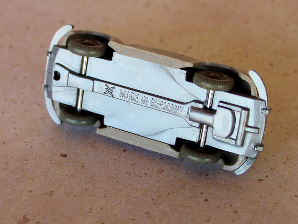 Plastic body with solid windows and very good details of front and rear hood, door seams and rear oval window with air louvers. Chassis molded in silver plastic with bumpers. Pin axles with plastic tires mounted to the chassis. Chassis stamped either WM – Made in Germany or just WM.