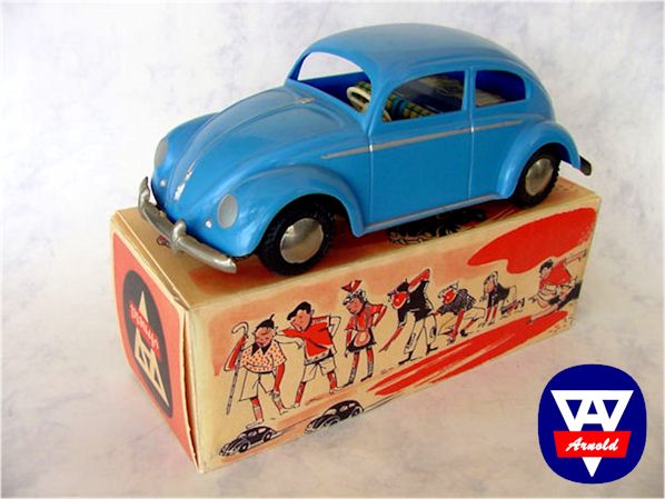 A metallic blue plastic body with a grey painted roof ARNOLD Oval VW was produced as a trade show exhibit and came in a special carton with the number 4159 and “das neue Modell 1959” printed on the carton.