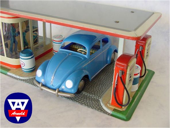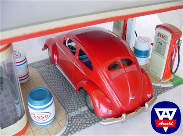 It also appears the ARNOLD Split VW toys were used as a promotional item for the petroleum manufacturers of the time. Special cartons were made by ARNOLD France and decals attached to the chassis for SHELL, BP, ARAL or ESSO. It's box had the shape of a garage and on the lid the number 4000 for the Split Beetle and the number 1000 for the ARNOLD fuel pump was mentioned. The box included the Split Window Beetle as well as a box with the fuel pump.