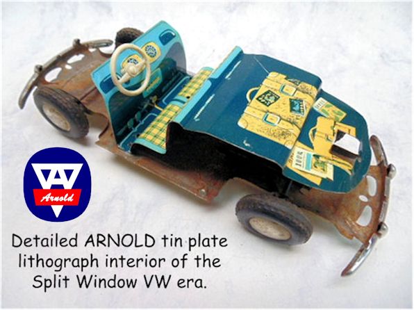 Detailed tin plate lithograph interior of the Split Window VW era, with steering wheel and shiny metal bumpers, seldom found with drivers. Chassis stamped with the ARNOLD insignia. Several variations are known such as a Fahrschule version with VW mounted on a wooden base with special headlights, etc. Another variation had a metal strip resting on the friction motor gear to produce a siren sound.