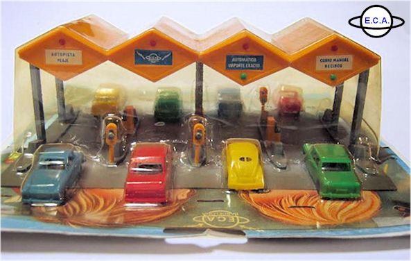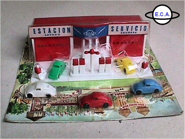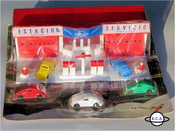 One piece plastic model without side rear windows. Metal axles with plastic wheels. Double garage and gas station set with 5 Split Window VWs mounted on a printed cardboard (in several designs) and plastic cover to hold everything in place. There is printing on the cardboard of “REF. 514 – ECA BARCELONA – SPAIN.” ECA copied these toys from the neighbouring company EKO, also located in Barcelona. The EKO splits on the other hand were copies of the German Wiking splits...... Unclear is whether EKO and ECA had a business connection. The garage shown is a SIKU copy!