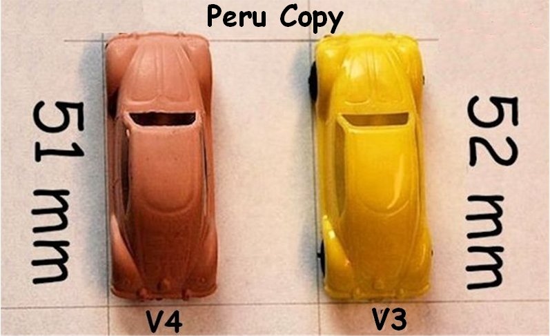 This Peruvian Hammer copy V4 has a one-piece plastic body with wheels part of the body, with cut out windows except for the rear window. It has DBGM and “6” engraved inside. Unlike the German version V1, this Peruvian version never came with a chassis. Remarkably all the known versions of this V4 Peruvian copy are 1 mm larger than the original German Hammer V2.