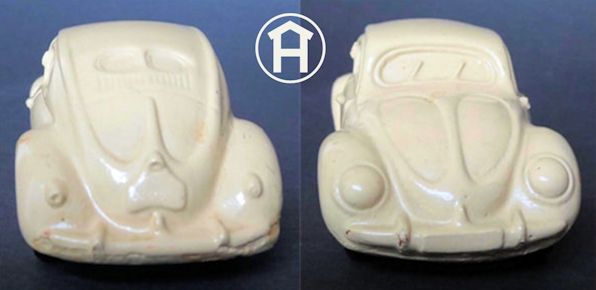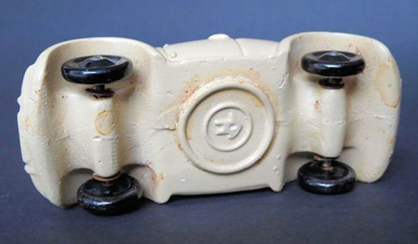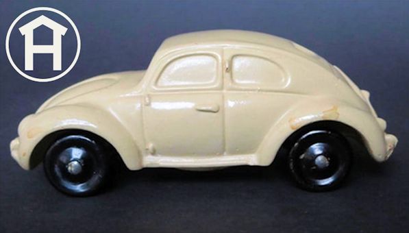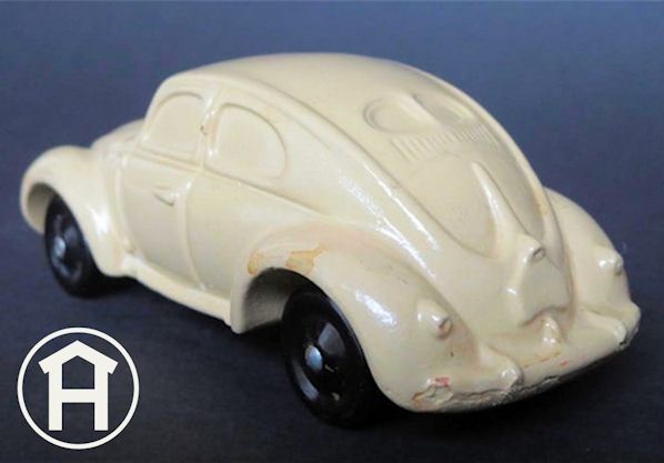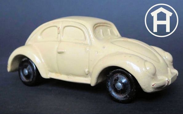 HAUSSER produced this KdF Wagen model design with good details. It is a one-piece hollow clay moulding with solid windows and incorporating bumpers, headlights and wiper blades on the windshield. Metal wheels on metal axles are inserted through holes in the clay baseplate. The baseplate is raised with a clay medallion with the HAUSSER logo. There are three known to exist and are believed to have been made as a prototype. A red model has silver highlighting on the windows, bumpers, lights, window wipers, door hinges and door handles. The third model is owned by an unknown German collector and little is known about its condition. The ivory and the red models were initially bought by a German toy dealer when the HAUSSER factory was cleared.