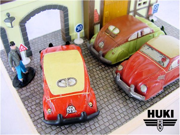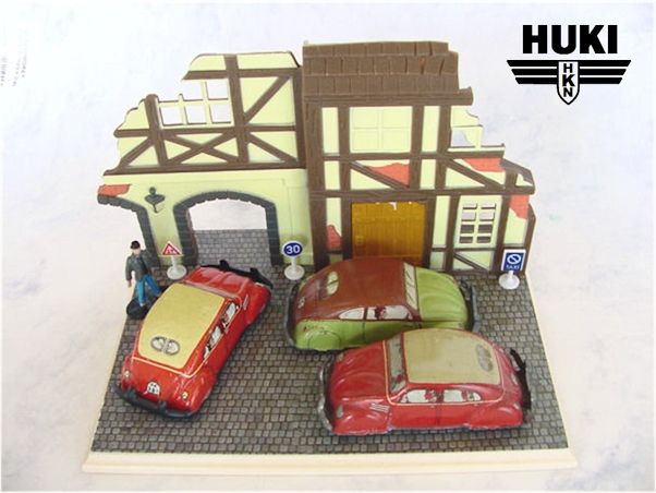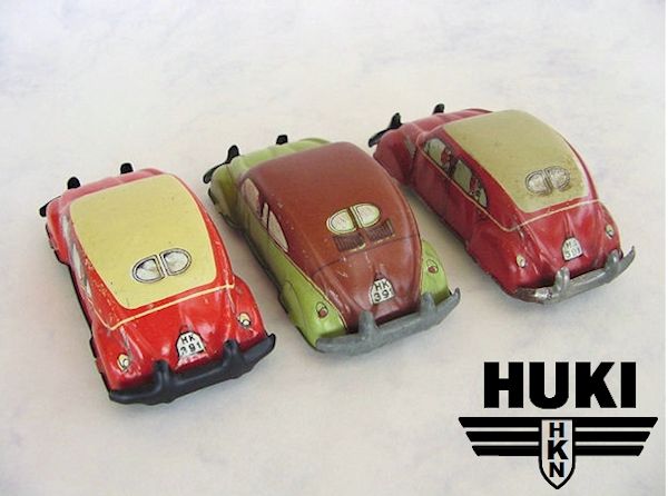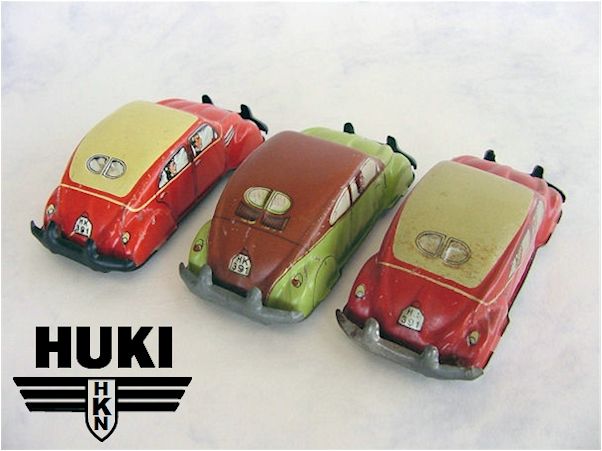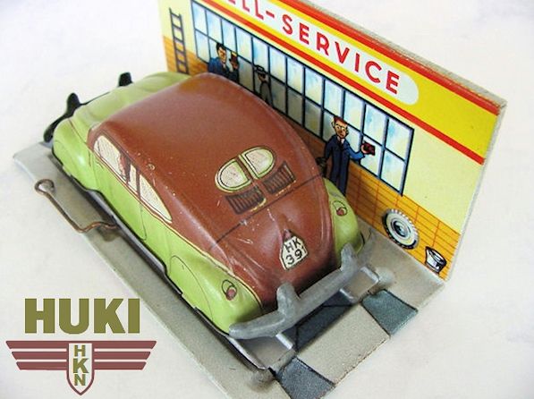 In 1910, Hubert Kienberger founded HUKI, Kienberger & Co., Nürnberg, Germany. They mainly produced Penny Toys and animals on wheels. Before WWII, they used the brand name KiCo, which was later altered into HUKI. In 1943 the Company was destroyed by a fire and only in 1951 production was restarted. Huki seized to exist in the second half of the seventies. Huki always produced tintoys and did not change to plastic cars like many other manufacturers. This caused their downfall. They had developed new toymodels until the late sixties; in their last decade ( or less) they only produced from their old molds....