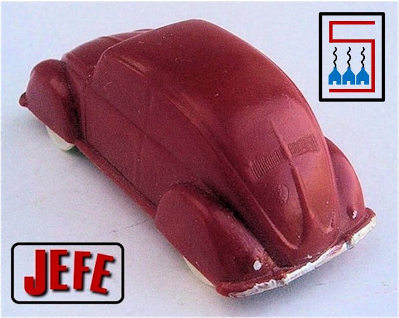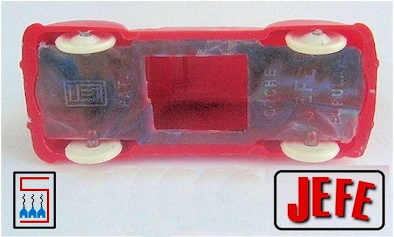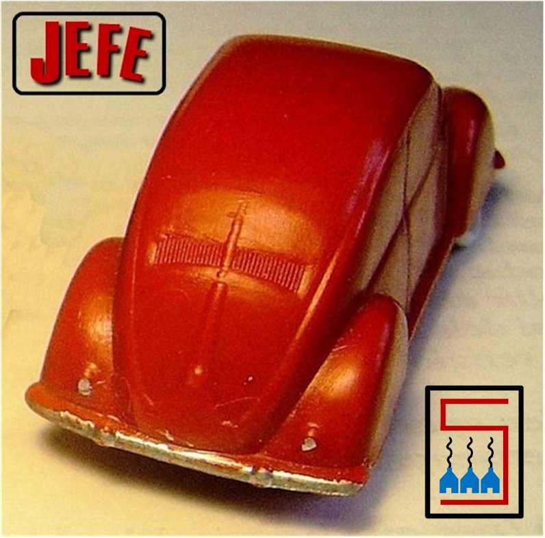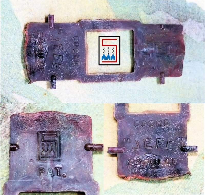 One-piece plastic body with unbroken windows and closed wheel wells. Silver painted detail. Brown plastic chassis with engravings: “JEFE” Coche Popular Pat. Plastic wheels.