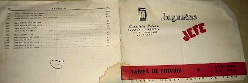 Industrias Saludes had its beginnings in a small family company founded in Valencia (Spain) in 1900 by Joaquín Saludes Amigó, a businessman, entrepreneur and specialized mechanic. The company initially focussed on manufacturing and selling road signage and vehicle registration plates. It was from the forties onward when the firm diversified its activity by incorporating new product lines for vehicles, motorcycles, nautical requirements and plastic toys. JEFE Juguetes was the brand name they used for the plastic toys.