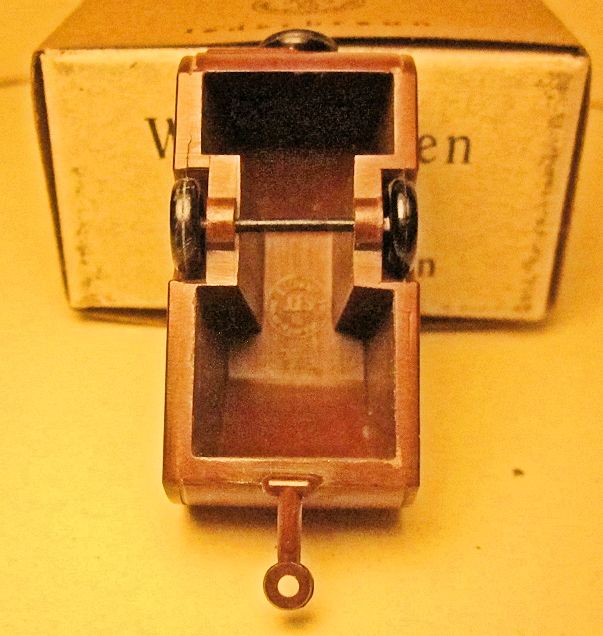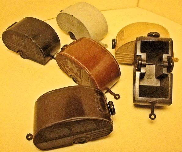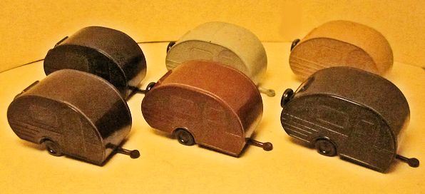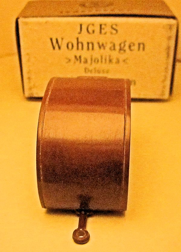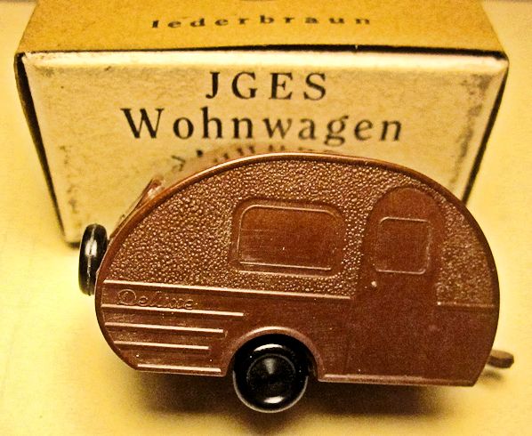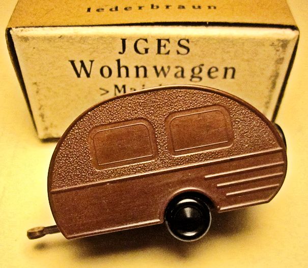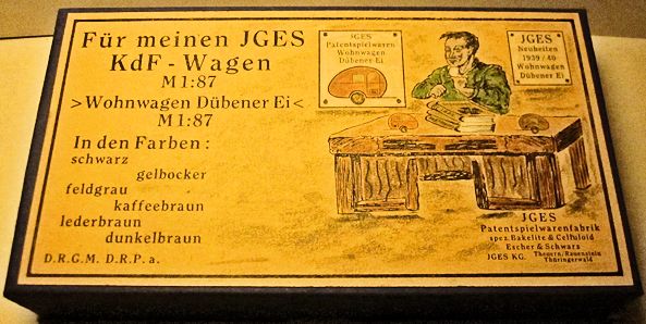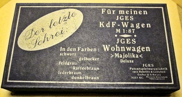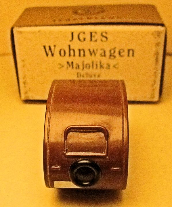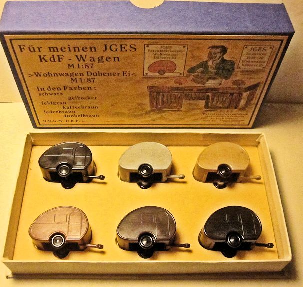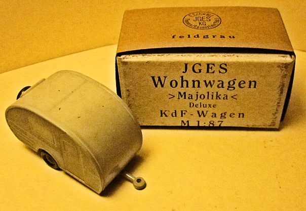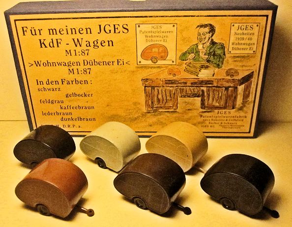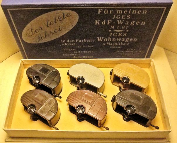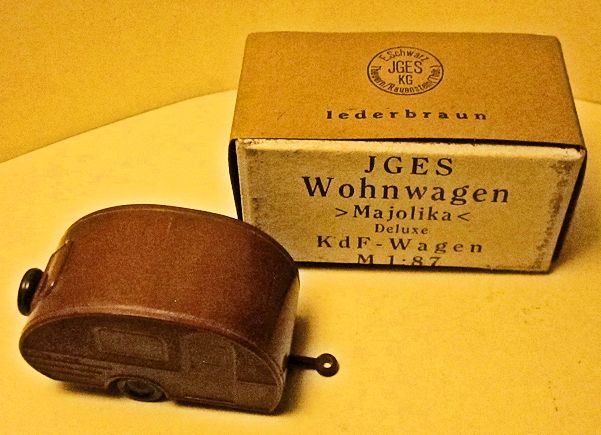 JGES produced in the KdF era a Deluxe Camp Trailer that could be towed with a KdF Wagen that had a tow hook. The Deluxe Camp Trailer had lines molded in the casting that represented a side door with window, a large side window and “Deluxe” lettering. On the opposite side was a double window and on the back was a single window with a spare tire. Two sets were made with different style boxes that contained 6 each of the Deluxe Camp Trailer. One of the sets depicted the famous "Dübener Ei" Camp Trailer and the second one depicted the "Majolika de luxe" Camp Trailer. The Deluxe Camp Trailer was also available as a single unit in a small box. All of the Deluxe Camp Trailers were produced in the six basic colors of yellow-cream, black, leather-brown, dark-brown, coffee-brown, field grey.
