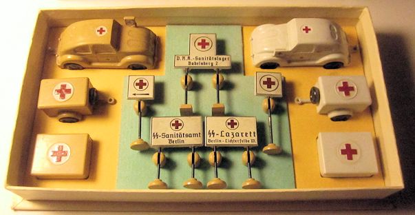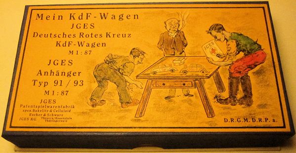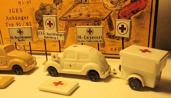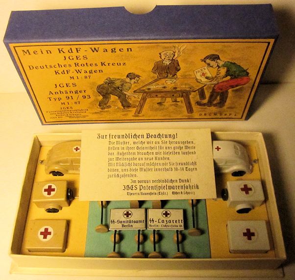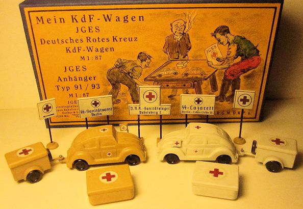 JGES produced the KdF WAGEN in two type of sets with the Deutsches Rotes Kreuz (German Red Cross) theme. The first set had two of the JGES KdF Wagens, one the yellow-cream color and the other white, both with the red cross insignia. The driver’s side front fender had a flag for the red cross insignia. Also in the set were two trailers with storage lids and five medical type signs. The KdF Wagens had a tow hook as part of the rear bumper for pulling the trailers.